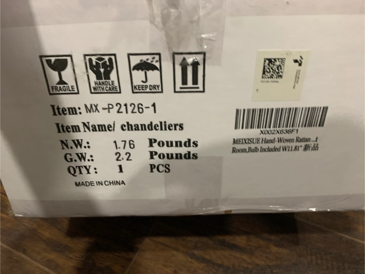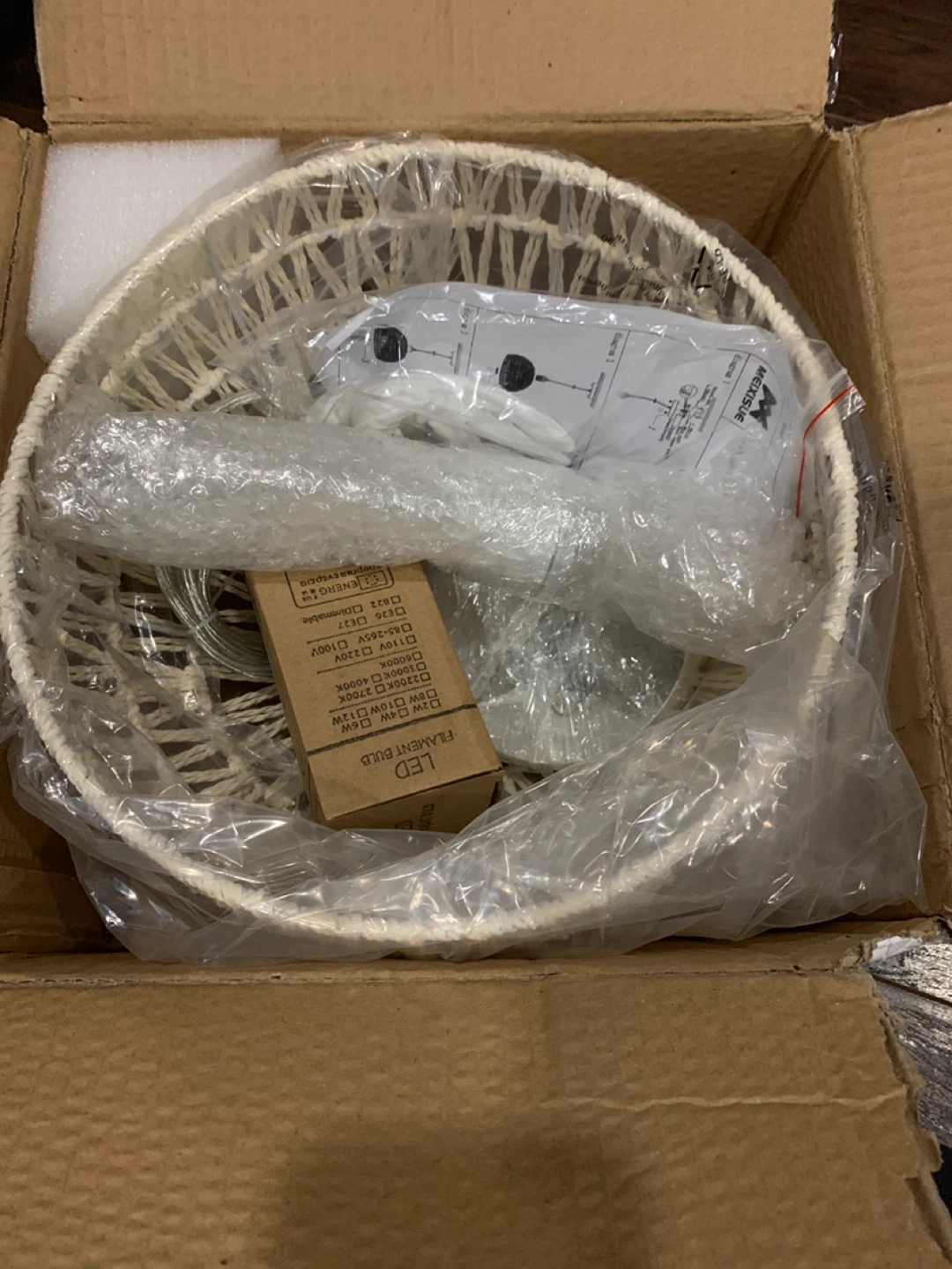 44Selling a brand new, hand-woven rattan chandelier! It comes in its original box and includes the necessary components for installation. It's a beautiful piece that would add a touch of natural elegance to any room