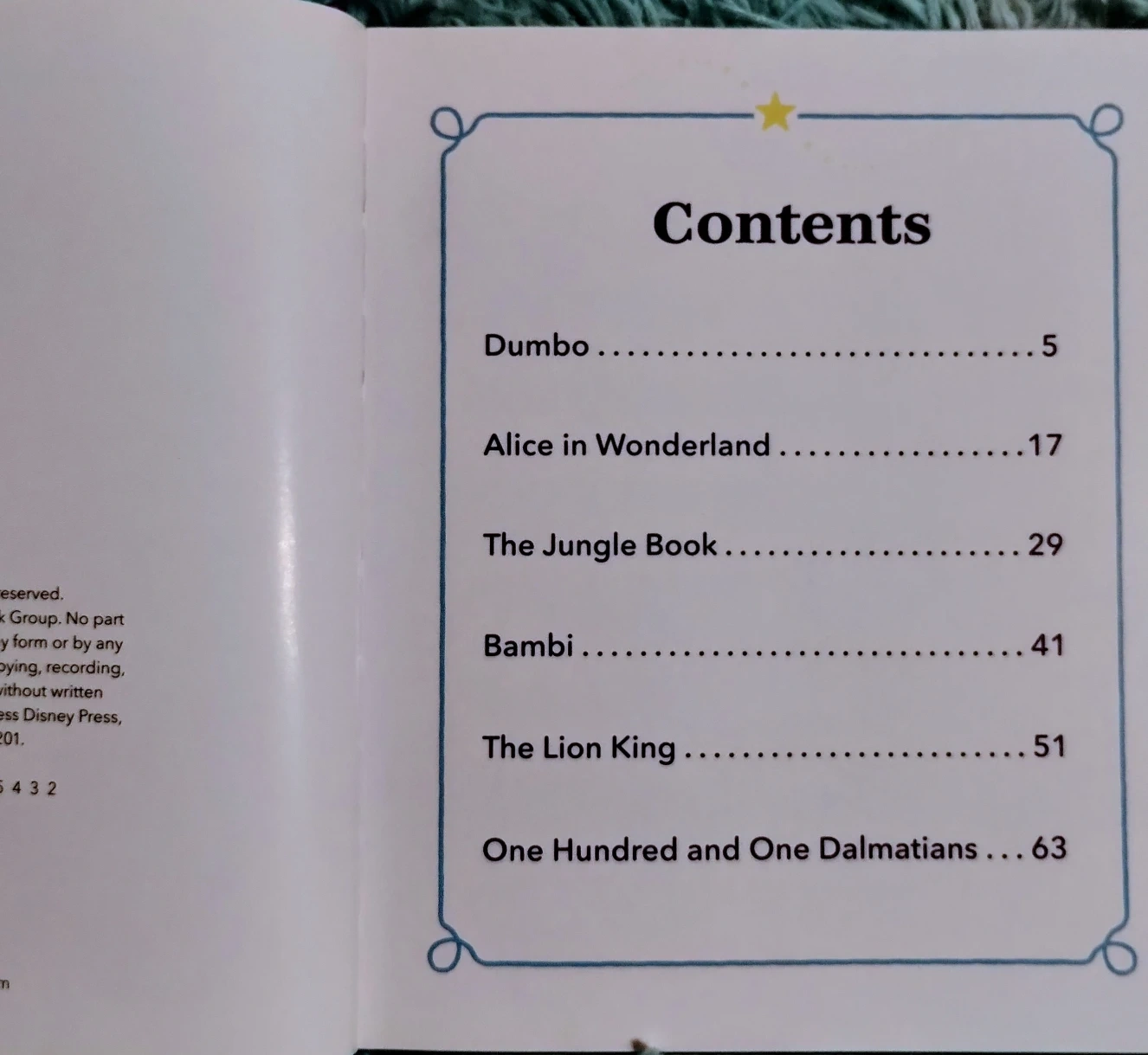 This is a Disney Classics "My First Bedtime Storybook". It includes the stories of Dumbo, Alice in Wonderland, The Jungle Book, Bambi, The Lion King, and One Hundred and One Dalmatians. It's perfect for those cuddly moments and bedtime stories for the little dreamers! Recommended for ages 3 and up