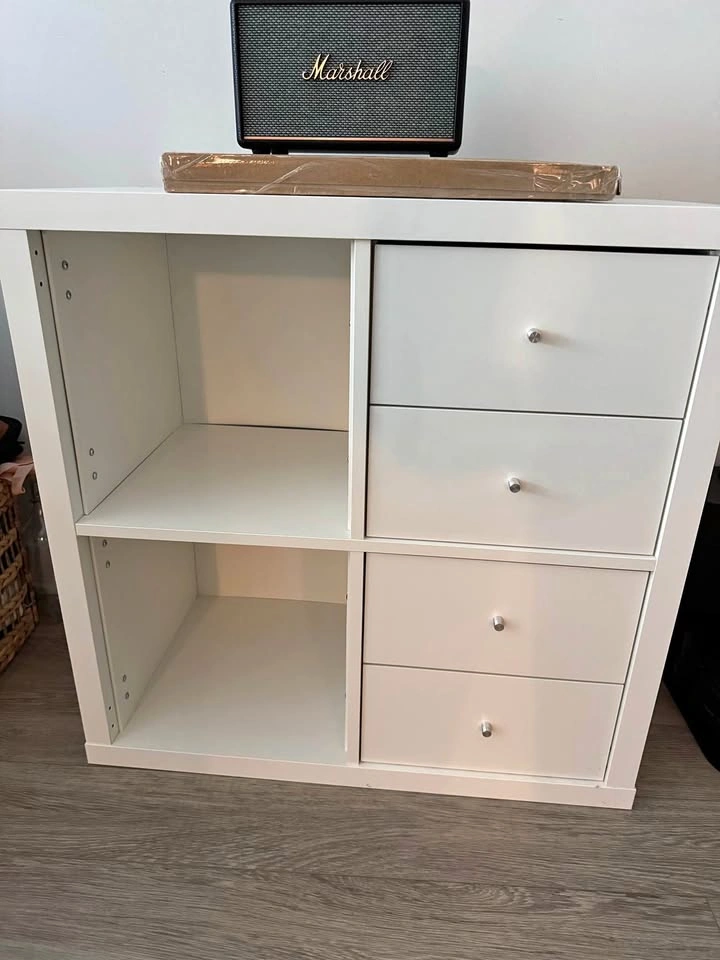 Selling an IKEA Kallax 4-cube shelving unit in white.