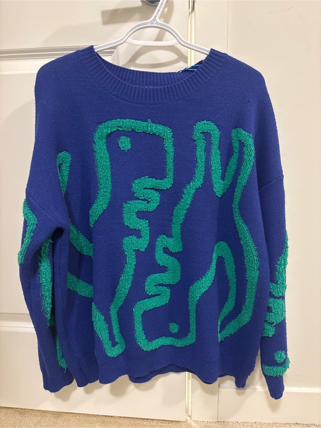 Cozy Dreamers sweater in a striking blue with a unique green design! It's super comfy and perfect for adding a pop of colour to your wardrobe. The knit material is soft and warm, great for those chilly days.