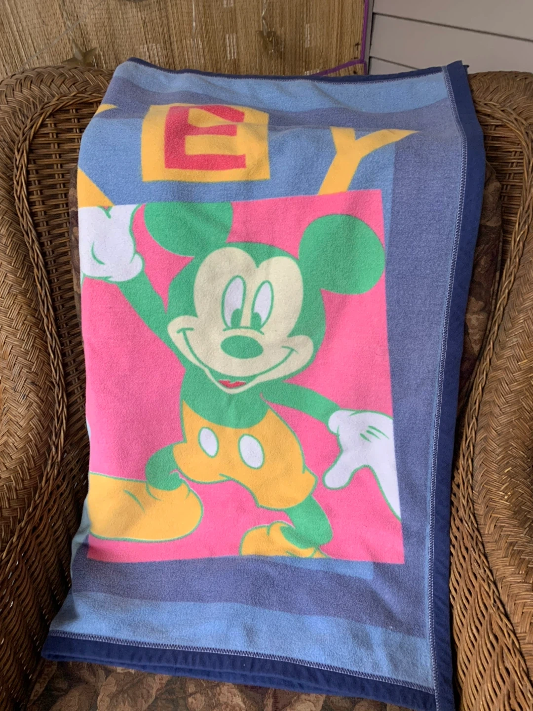 Here's a colourful Vintage machine sewn Mickey Mouse throw blanket! It features a fun and bright design with Mickey Mouse in various poses. Perfect for adding a touch of Disney magic to any room.