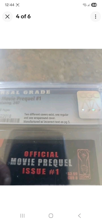 Selling a CGC Universal Grade 9.8 copy of Transformers: Movie Prequel #1. It's an error version with Chris Ryall & Simon Furman story and Don Figueroa art. This issue has white pages and was published by IDW Publishing in February 2007. There are two different covers, one regular and one wraparound, and this one was manufactured with incorrect text on page 5