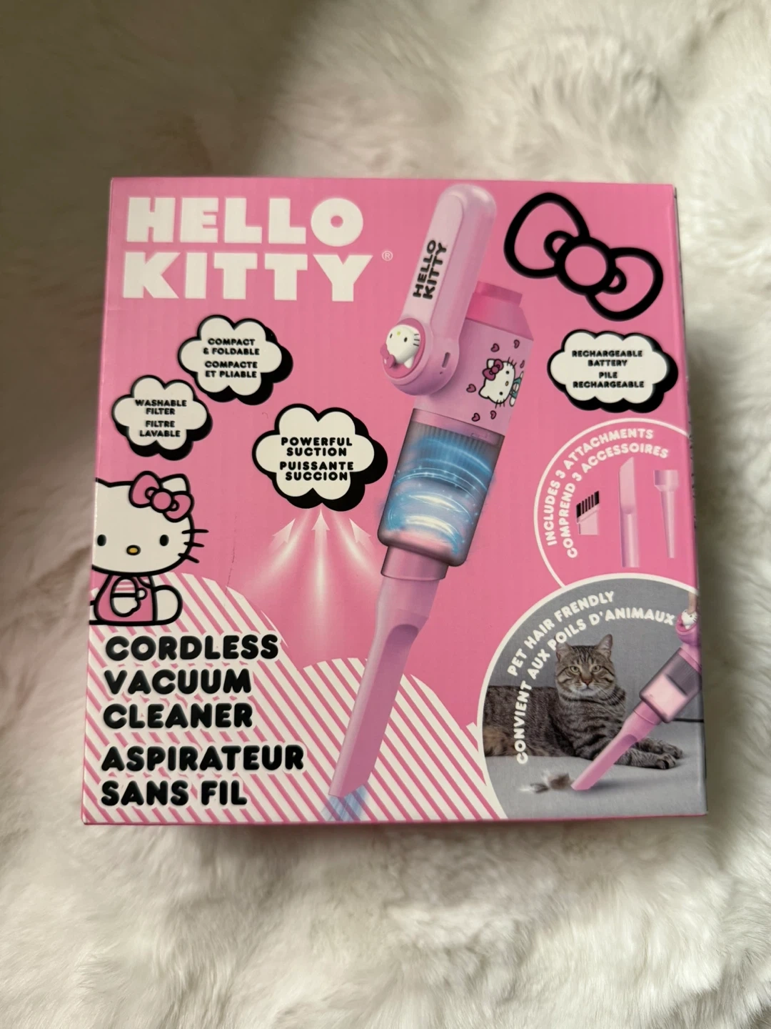 Brand new Hello Kitty cordless vacuum cleaner! It's compact and foldable, making it easy to store. The filter is washable, and it comes with 3 attachments and accessories. Perfect for cleaning up dust, dirt, and pet hair in an adorable style!