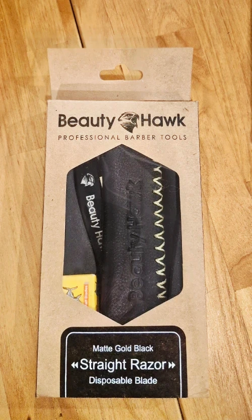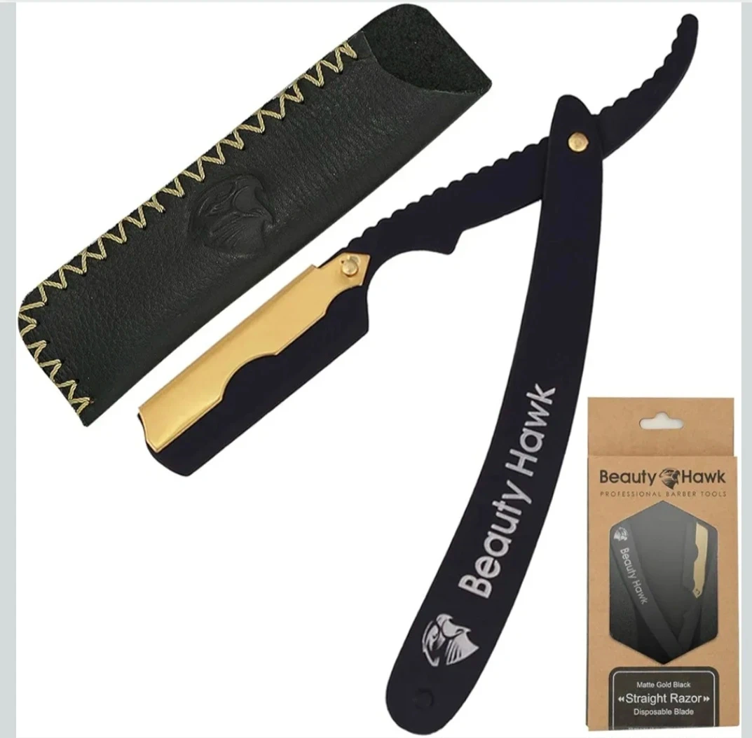 Beauty Hawk professional straight razor. New. It's a matte gold black straight razor with a leather pouch and additional blades. The simple design of the straight razors give a clean, exquisite appearance and are perfectly sized.