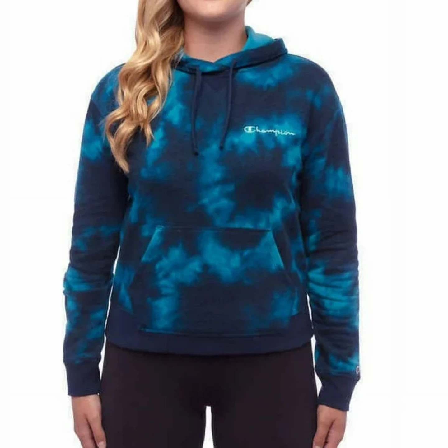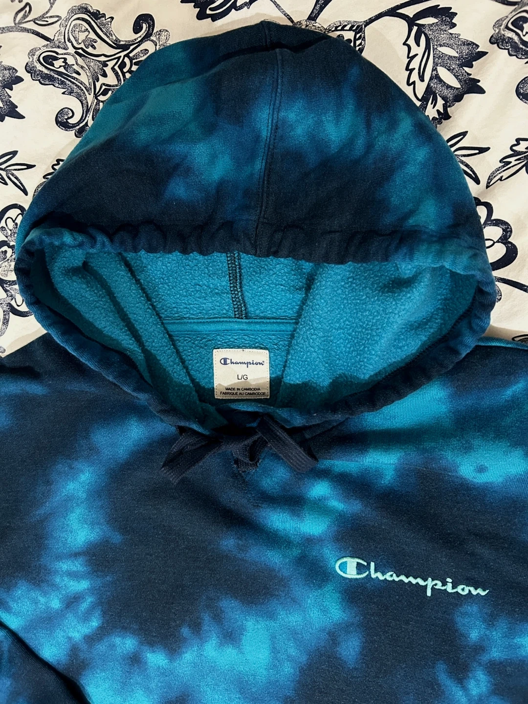 Champion hoodie with blue tie-dye pattern! Soft and comfortable material. Perfect for staying warm and stylish on those chilly days. Size L (women’s large size). Good condition - gently worn/washed.