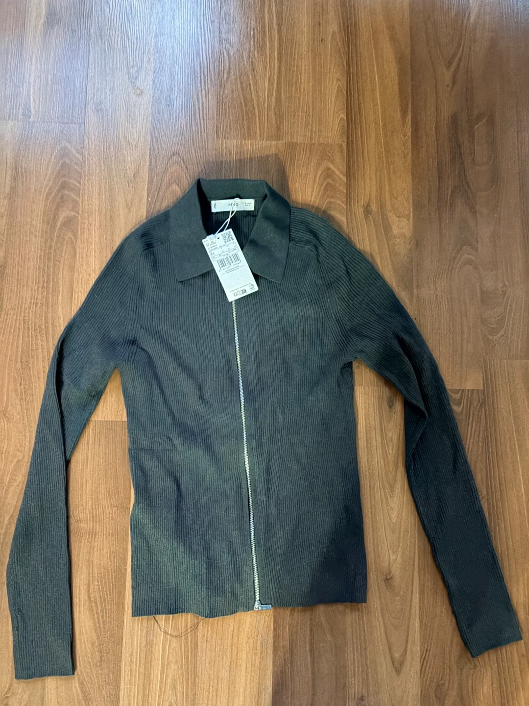 Selling a Mango ribbed zip-up cardigan in size small! It's a stylish and comfortable piece, perfect for layering. The dark green colour is versatile and easy to match with different outfits. It's in great condition and ready for a new home!