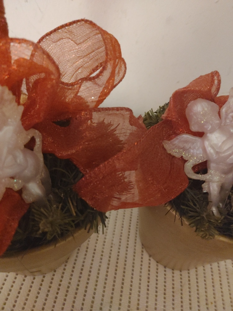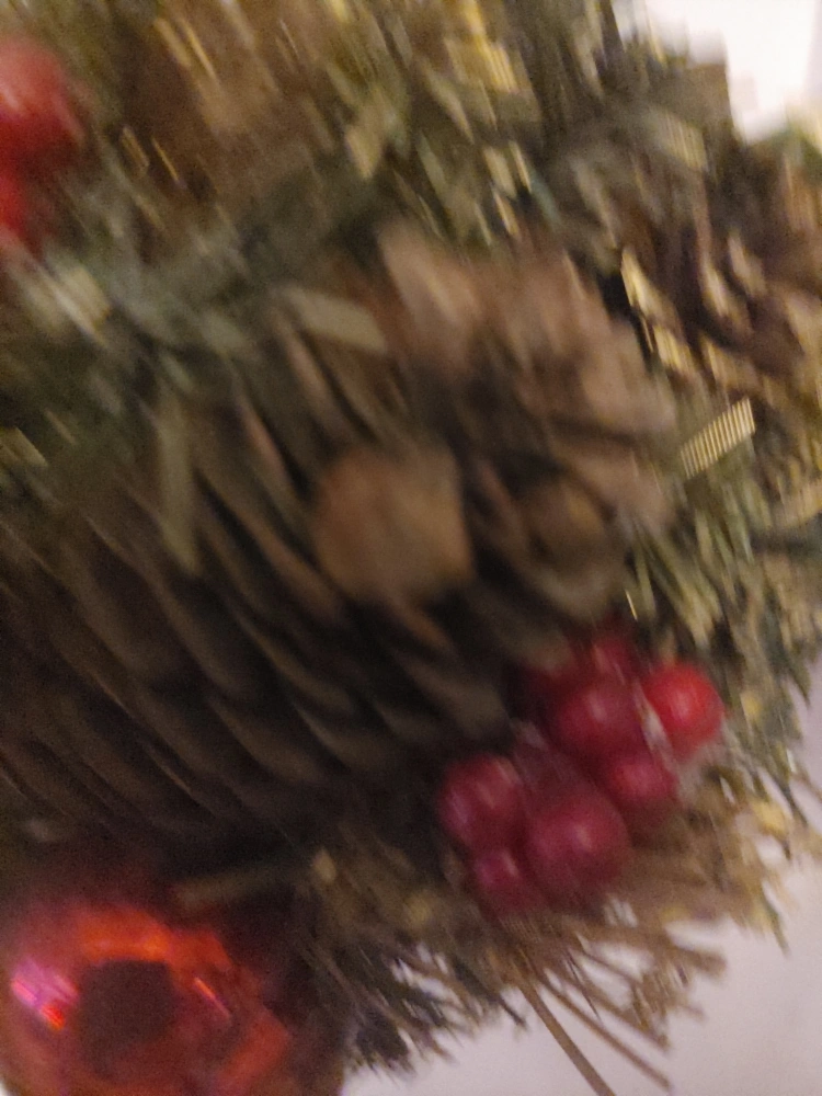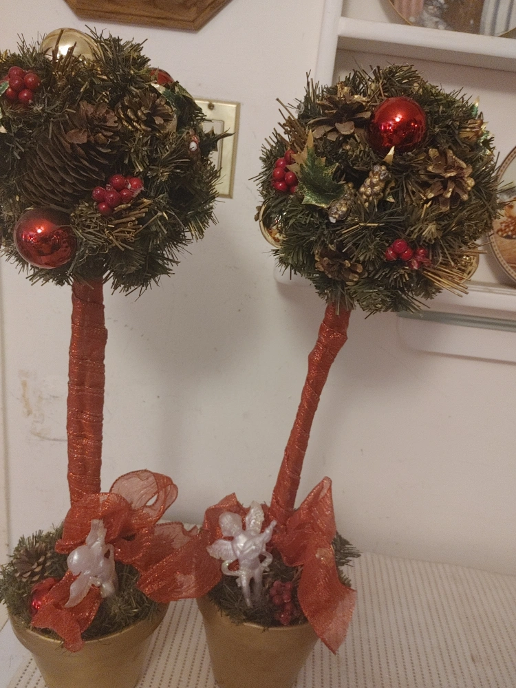 Two cute Christmas topiary decorations, perfect for adding a festive touch to your home! They feature pinecones, berries, and red ornaments.