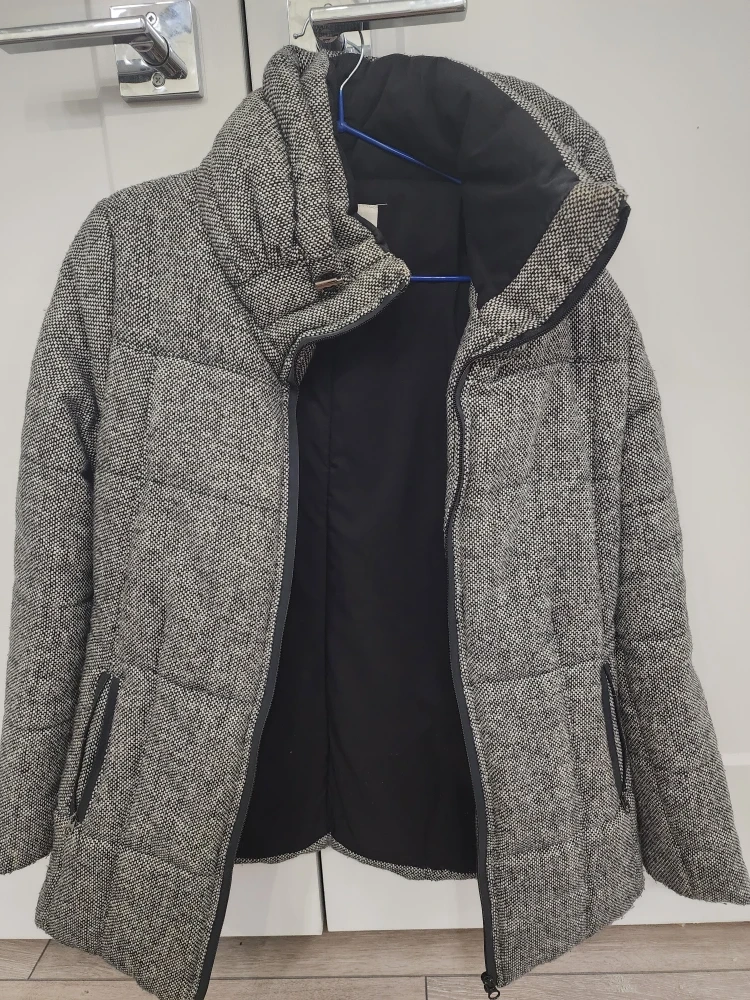 Selling a gently used puffer jacket! It's a stylish grey colour and perfect for staying warm during the colder months. It has a nice, comfortable fit and is in great condition. (no waterproof)