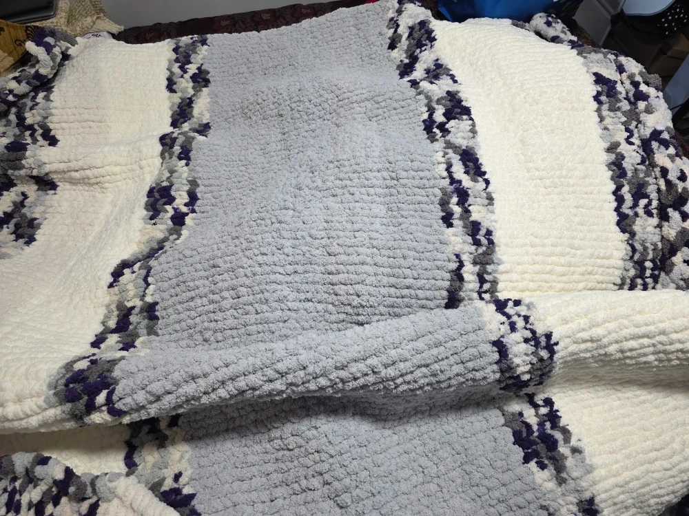 Queen size Handmade Chunky Knit Blanket - Grey, White, Purple