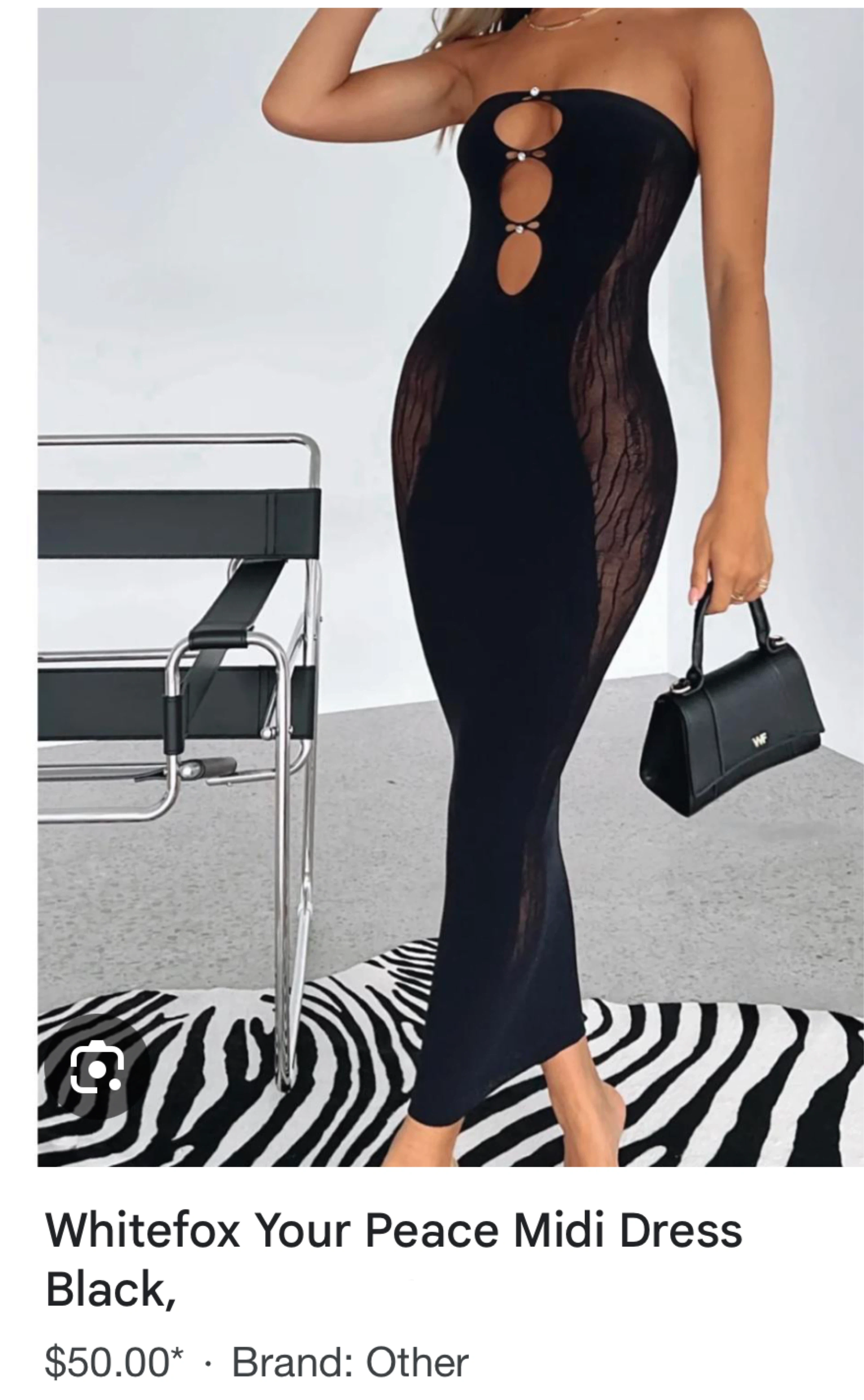 Selling a NEW IN BAG White Fox Boutique 'Your Peace' midi dress in black. It's a strapless style with unique cut-out detailing and sheer panels. $50