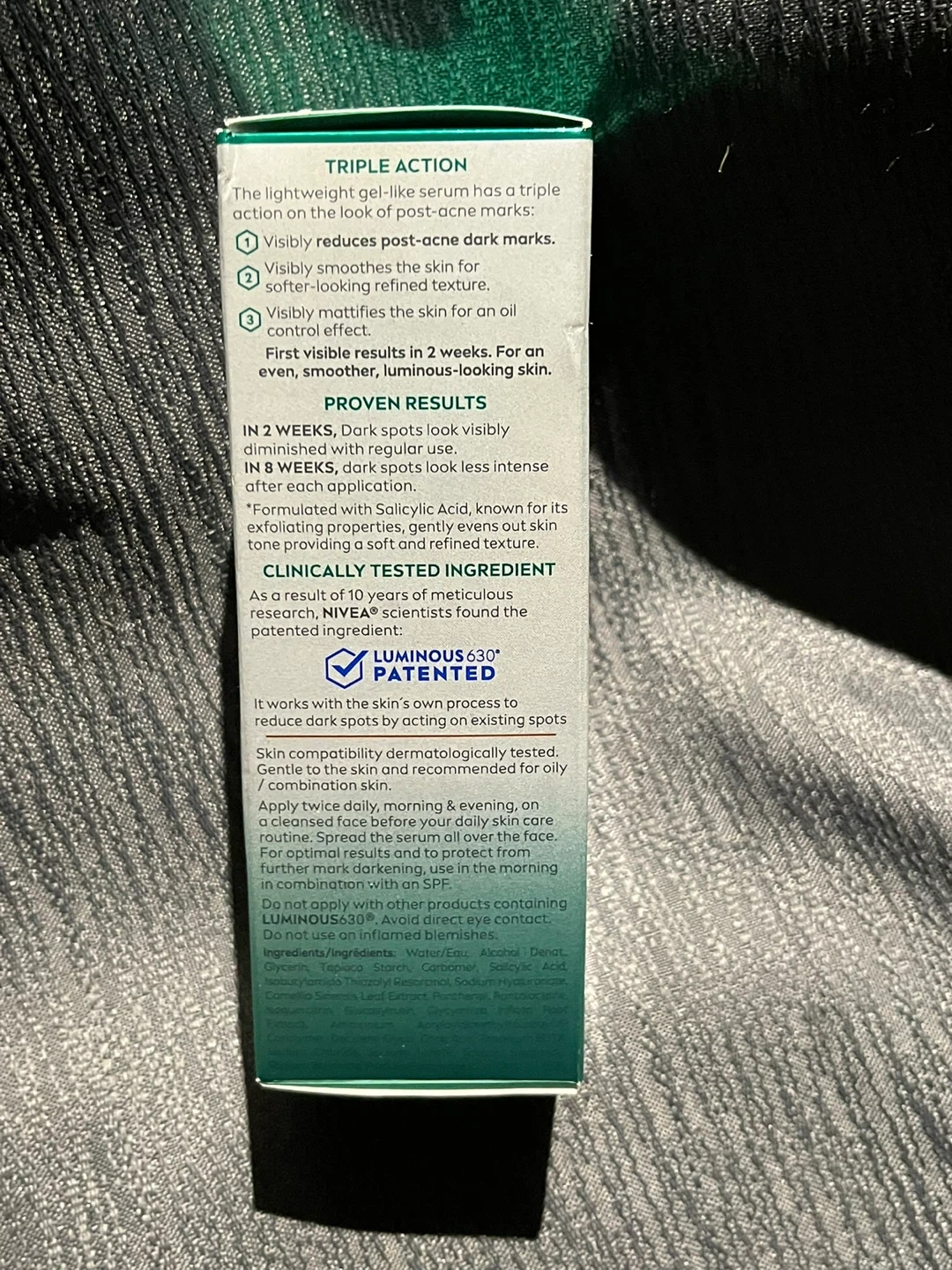 I'm selling a brand new Nivea Luminous 630 Dark Spot Solution Post-Acne Marks Serum! This lightweight gel-like serum has a triple action to reduce post-acne dark marks, visibly smooths the skin, and visibly mattifies the skin for oil control. It contains Luminous 630 and Salicylic Acid, and comes in a 30ml bottle
