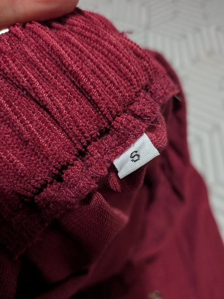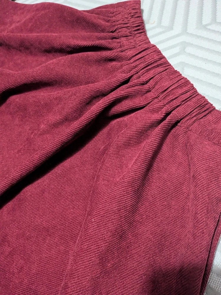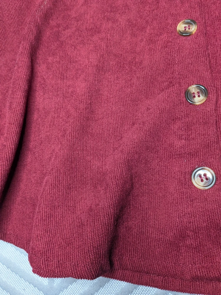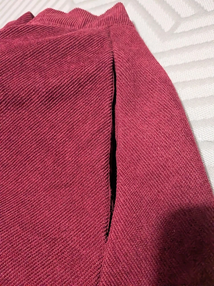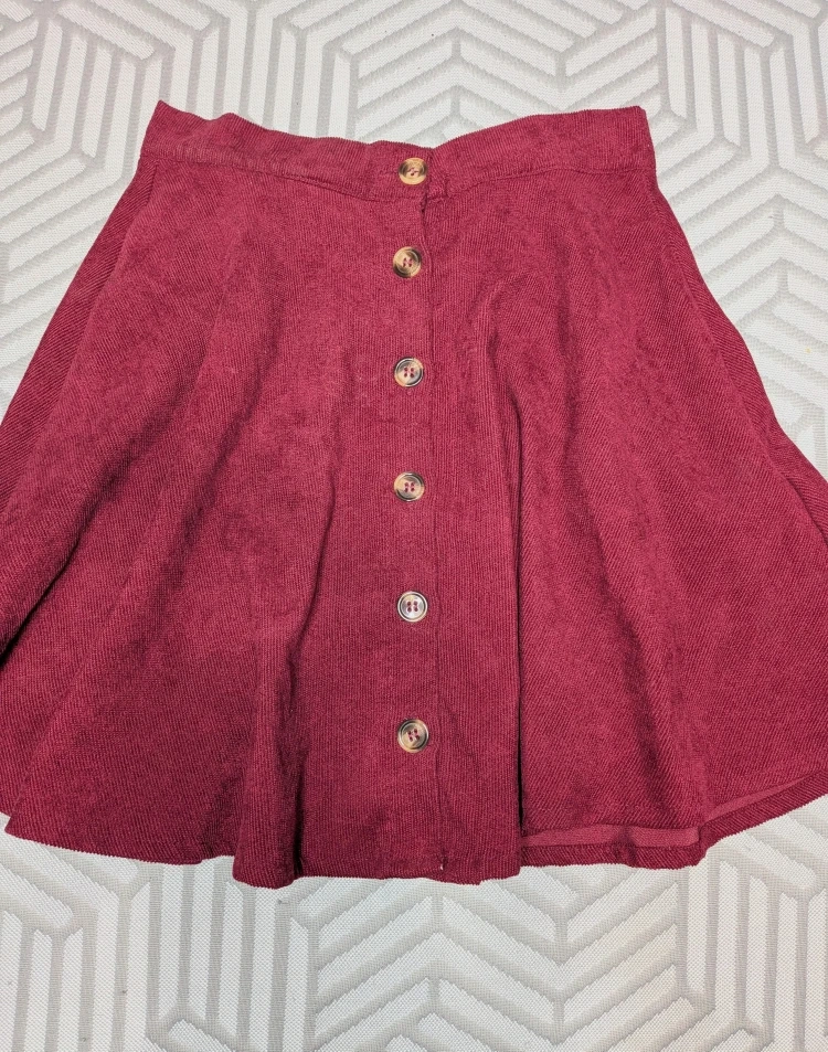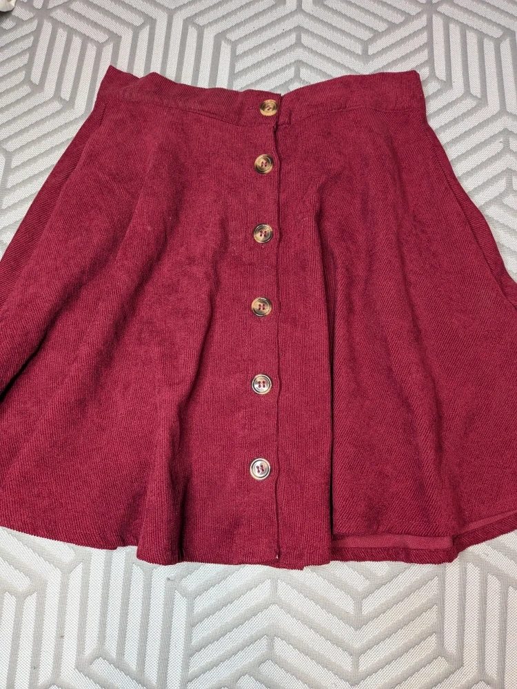 180Here's a cute burgundy corduroy skirt! It's a size small and features button detailing down the front. The material is lightweight, soft and comfortable, perfect for everyday wear No label, just size S Waistband is elasticized at back for size adjustment. Measures approximately 24 inches in stretched and stretching to about 28 inches max Will fit most hip sizes,, lots of fabric and flare! About 17 inches top of waistband to bottom hem Only worn once, good condition No holds, first come, first serve Cash only, No etransfers Location: Etobicoke. Rathburn Road and Renforth drive. Etobicoke Olympium nearby. 5 mins from Pearson Airport . I cannot meet outside this area