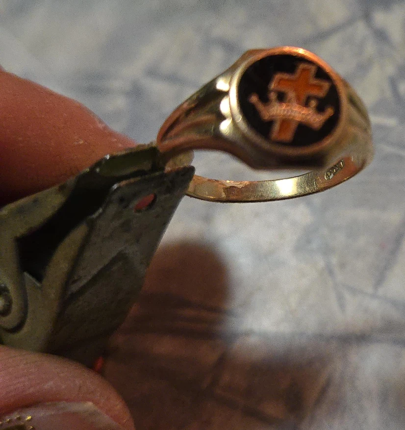 Selling a vintage gold signet ring that features a unique design with a crown and a cross. It's a really cool looking piece!