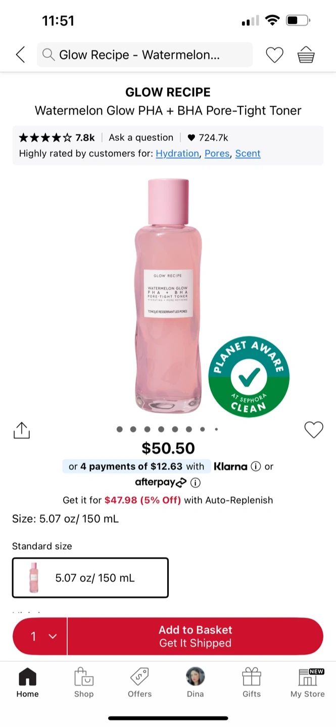 Selling a bottle of Glow Recipe Watermelon Glow PHA + BHA Pore-Tight Toner. It's the standard size, 5.07 oz / 150 mL. Highly rated for hydration, pores, and scent! Originally bought for $50.50