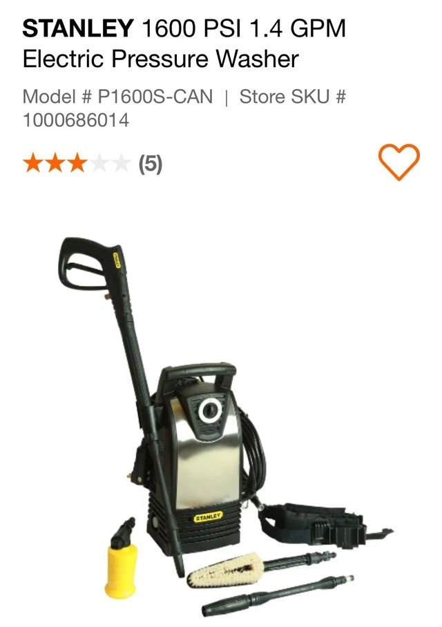 Stanley electric pressure washer. Used for two seasons. No leak. Good working condition. The only issue is missing the garden hose adapter which can be bought from Amazon.