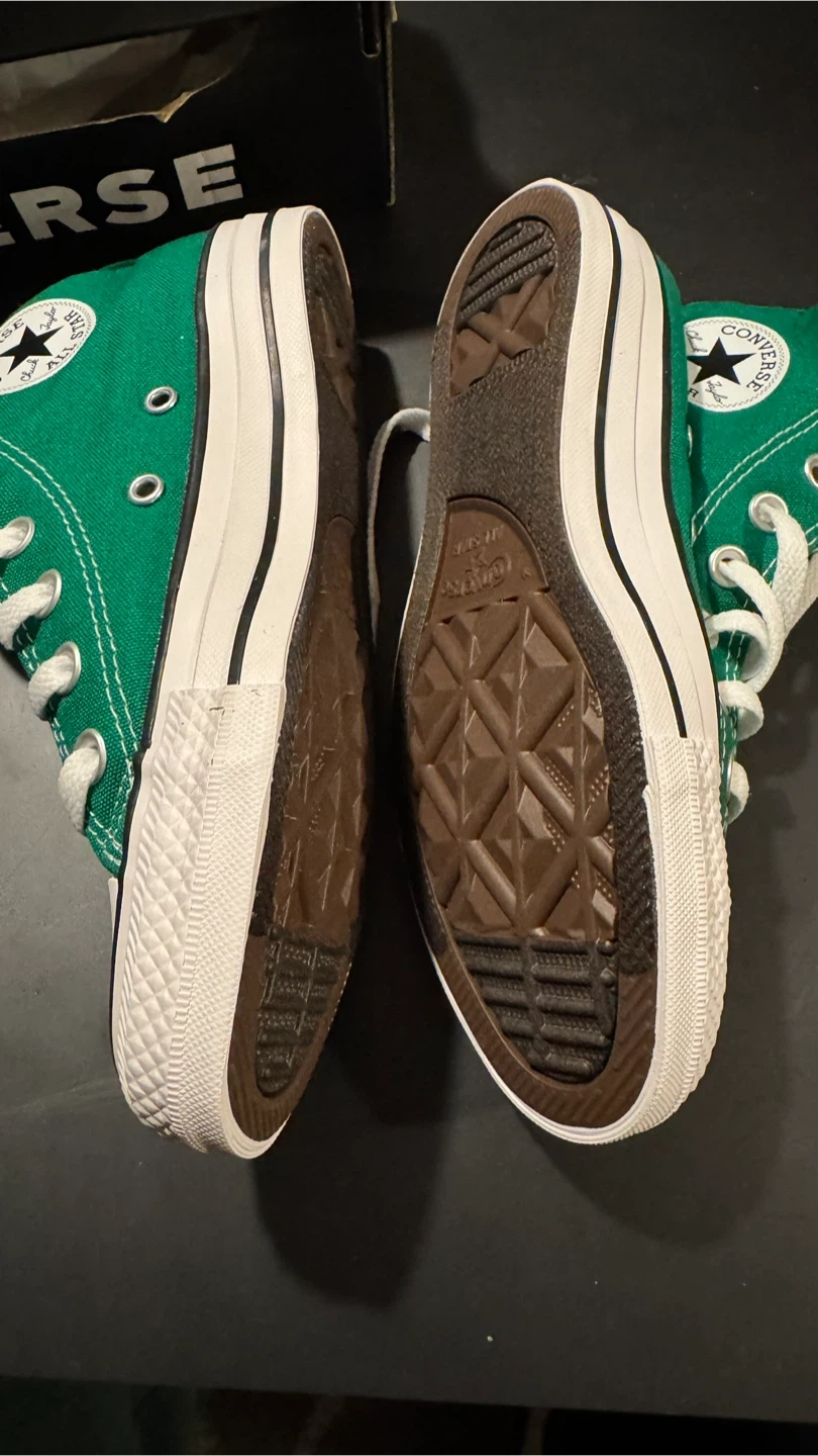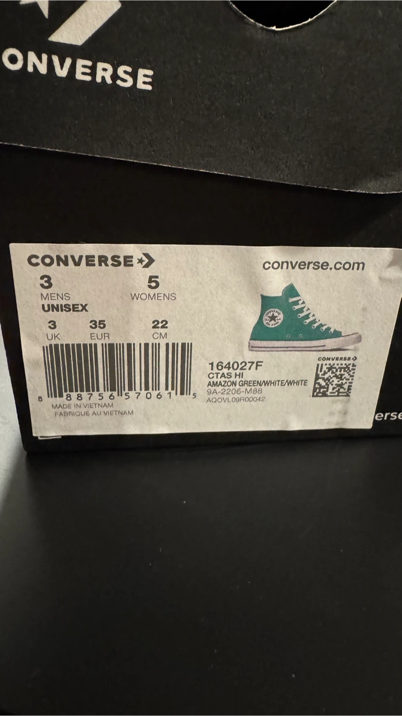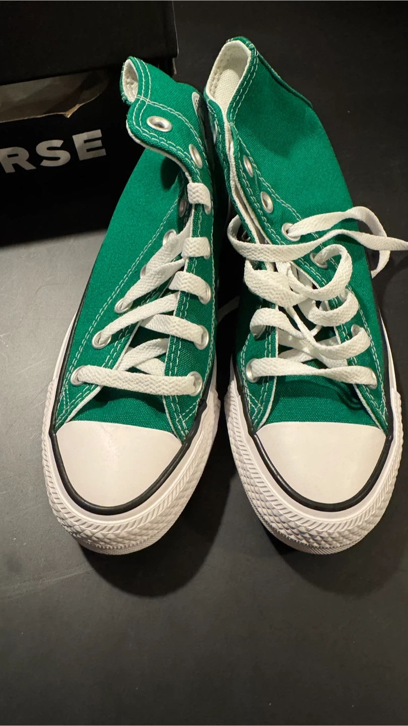 Selling a pair of green Converse All Star high tops! They come with the original box. Great for adding a pop of colour to any outfit. Brand new never worn. Unisex men size 3 or women sz 5.