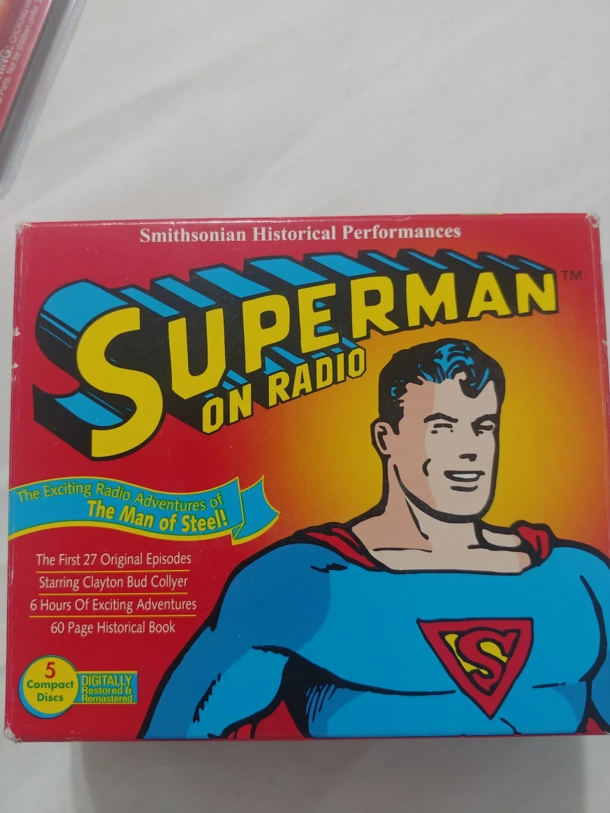 Selling a 'Superman On Radio' box set from Smithsonian Historical Performances! This set includes the first 27 original episodes starring Clayton Bud Collyer. You'll get 6 hours of exciting adventures and a 60-page historical book, all on 5 compact discs that have been digitally restored and remastered