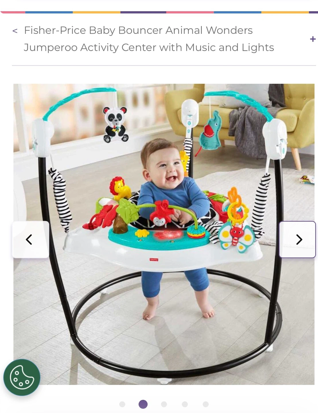 This Fisher-Price Baby Bouncer Animal Wonders Jumperoo Activity Center is great for keeping your little one entertained with music and lights! It's in good condition and ready for a new home. Perfect for babies who love to bounce and explore!