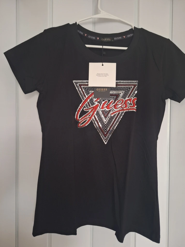 Cute Guess T-shirt with a sequin logo design! It's a black T-shirt with the Guess logo in red and silver sequins. Perfect for adding a bit of sparkle to your outfit