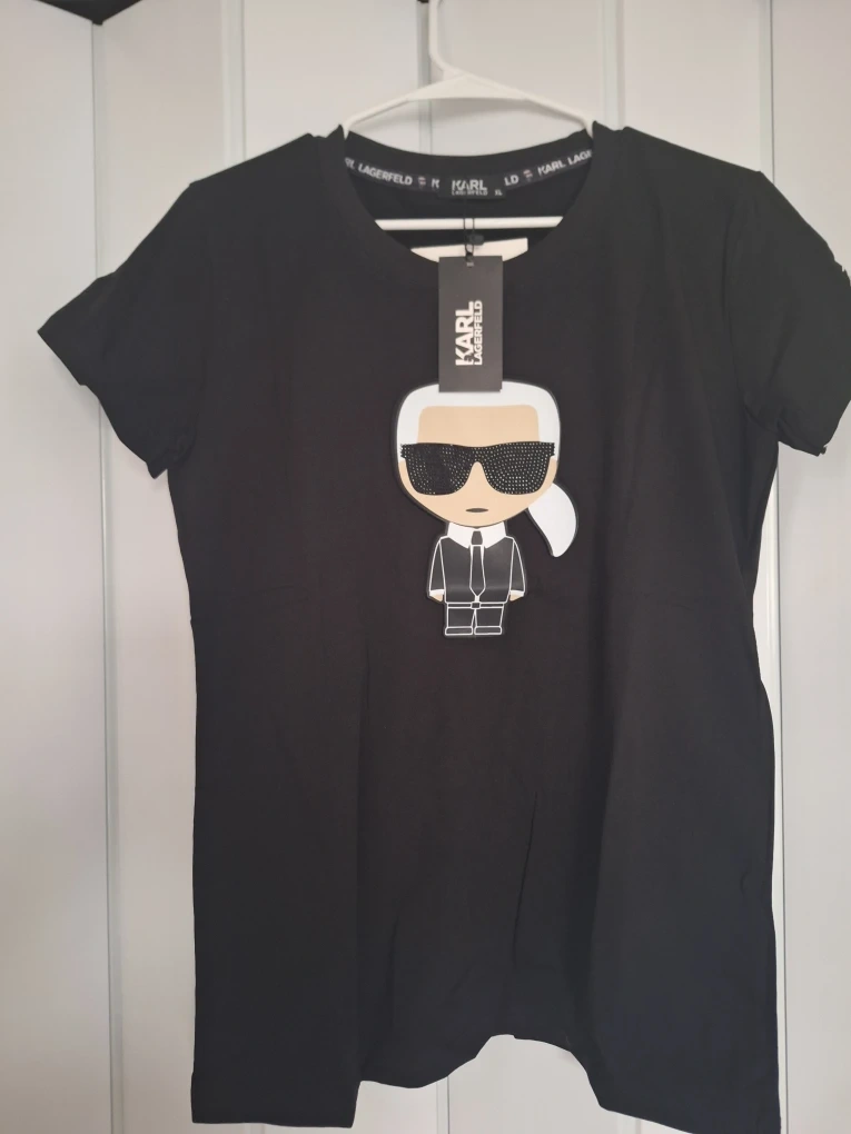 Selling a Karl Lagerfeld black t-shirt in size XL. It's in great condition and features the iconic Karl Lagerfeld design. Perfect for adding a touch of designer style to your wardrobe!