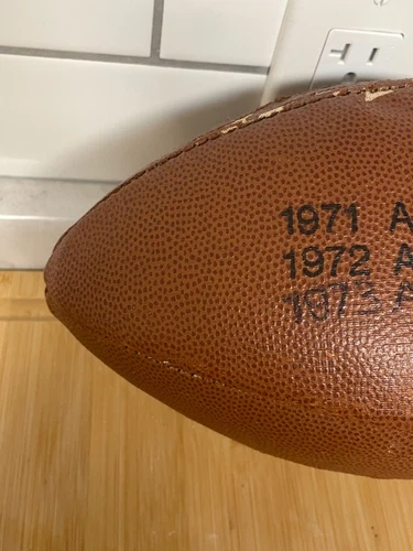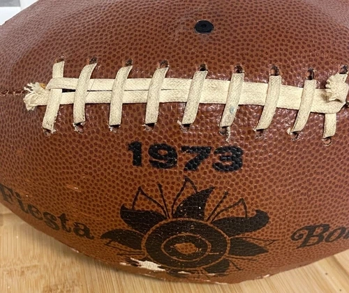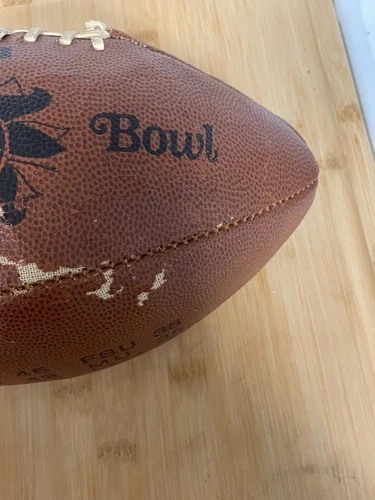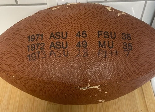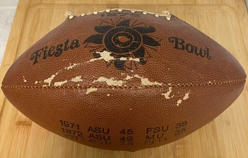 This is a football from the 1973 Fiesta Bowl game between the Arizona State Sun Devils and the University of Pittsburgh Panthers. The ball has been signed by Johnny Majors, who played for Pittsburgh in the game. The game ended with Arizona State winning 28-7. This ball is an original item and was manufactured in the United States. It is a great addition to any sports memorabilia collection for fans of both teams. REDUCED BY $50GOTTA GO, MAKE OFFER
