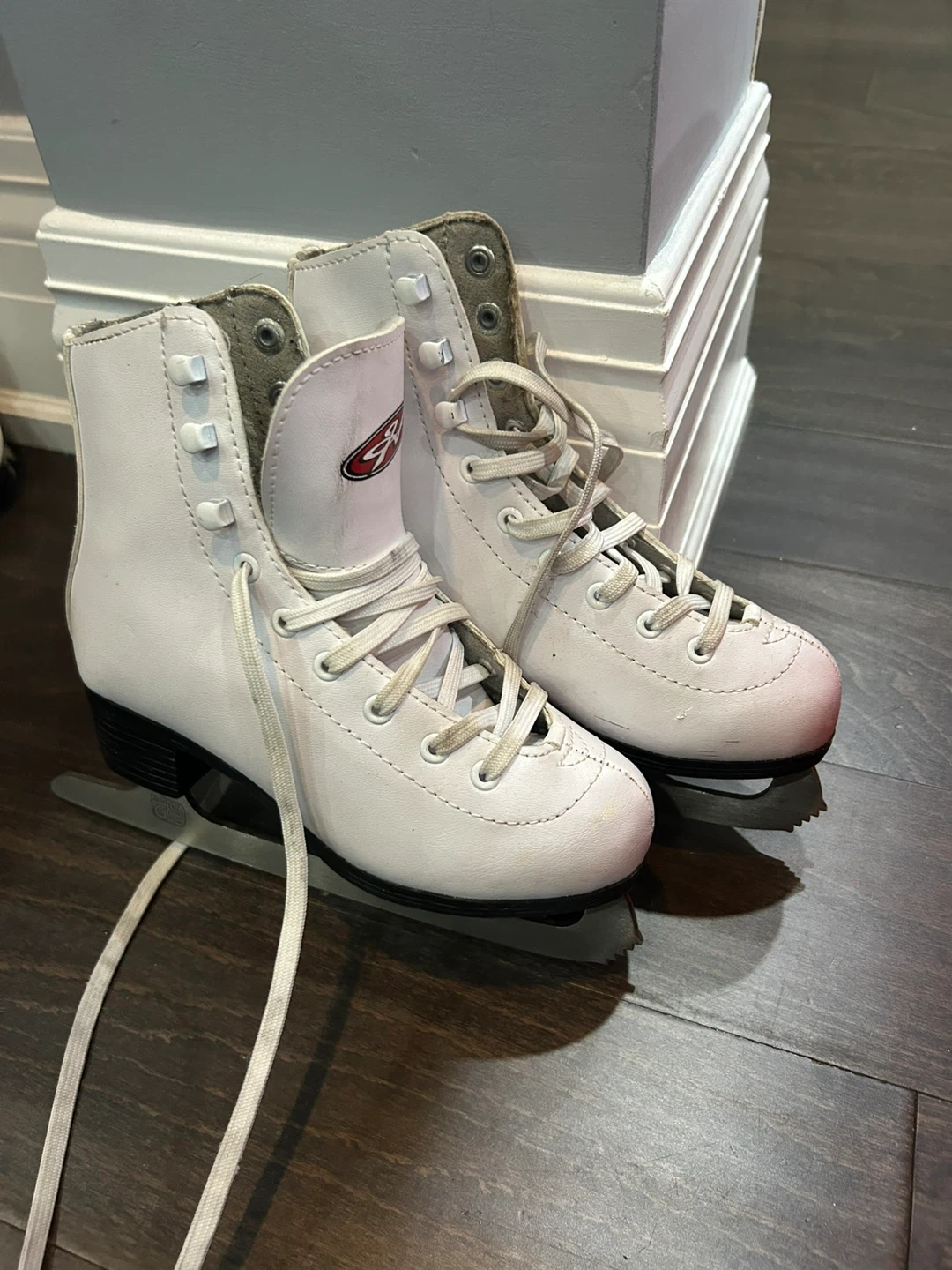 Selling a pair of Hespeler figure skates in size US J1. They're white and in good condition, ready for some fun on the ice!