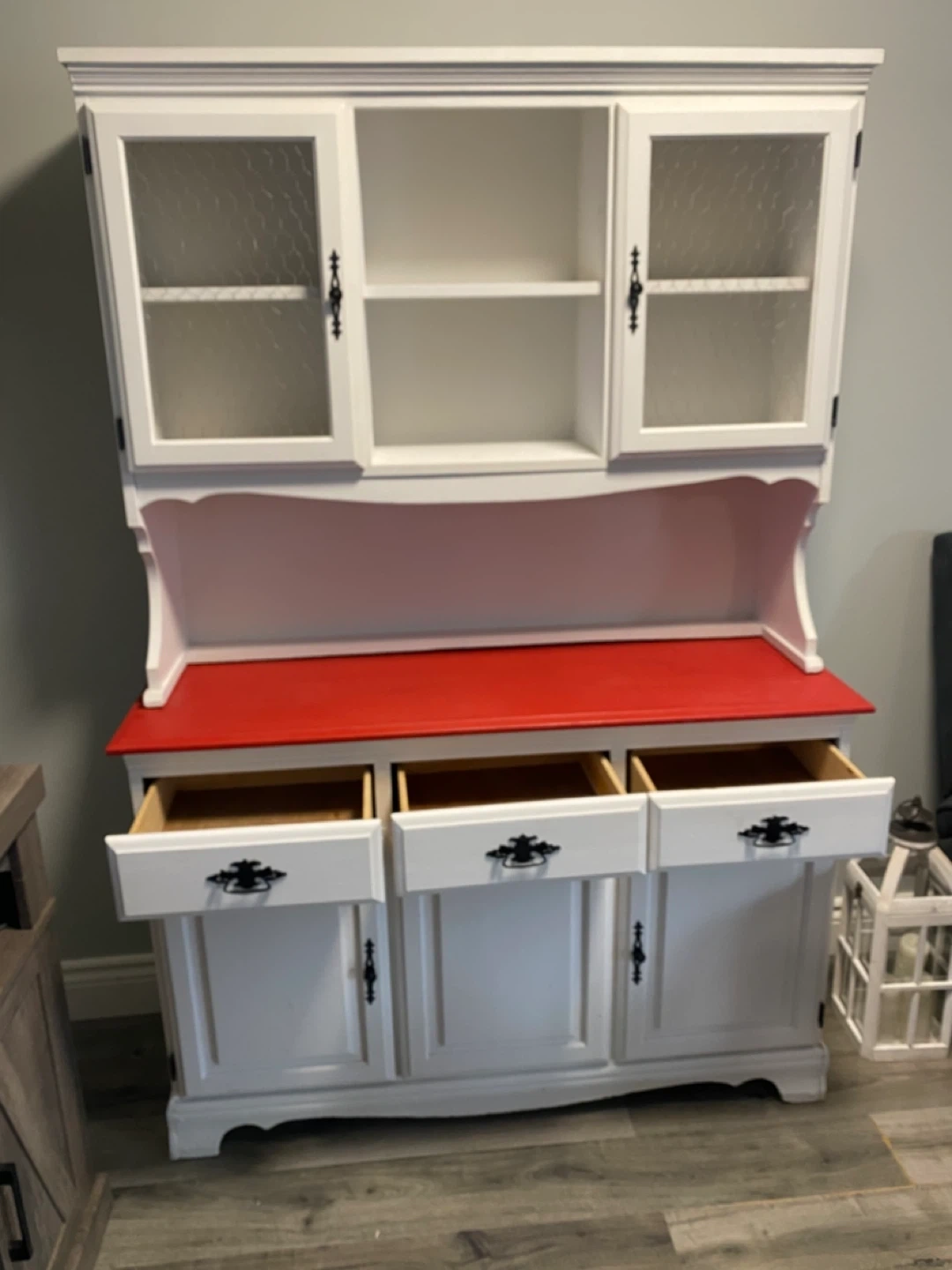 Selling a charming 2 piece hutch cabinet, painted in a lovely white with a vibrant red countertop! It features upper cabinets and drawers for storage down below. Perfect for adding a touch of character to your dining area or kitchen.