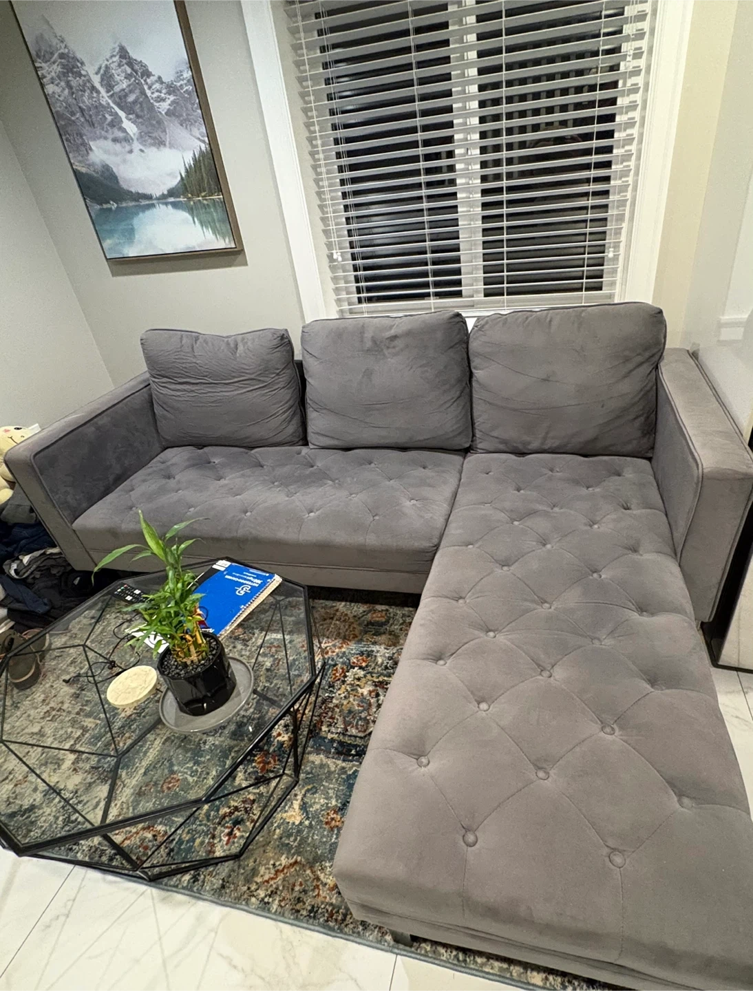 Selling a comfy grey sectional sofa! It's in great shape and would be perfect for a living room or den. The cushions are soft and the chaise lounge is perfect for relaxing after a long day. It's a stylish and functional piece of furniture!