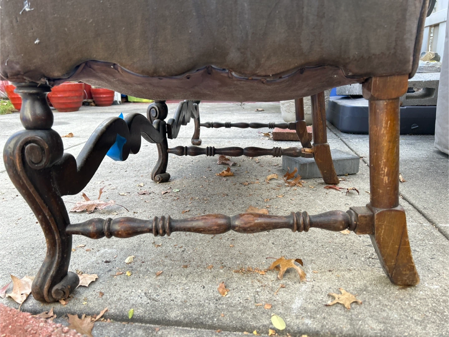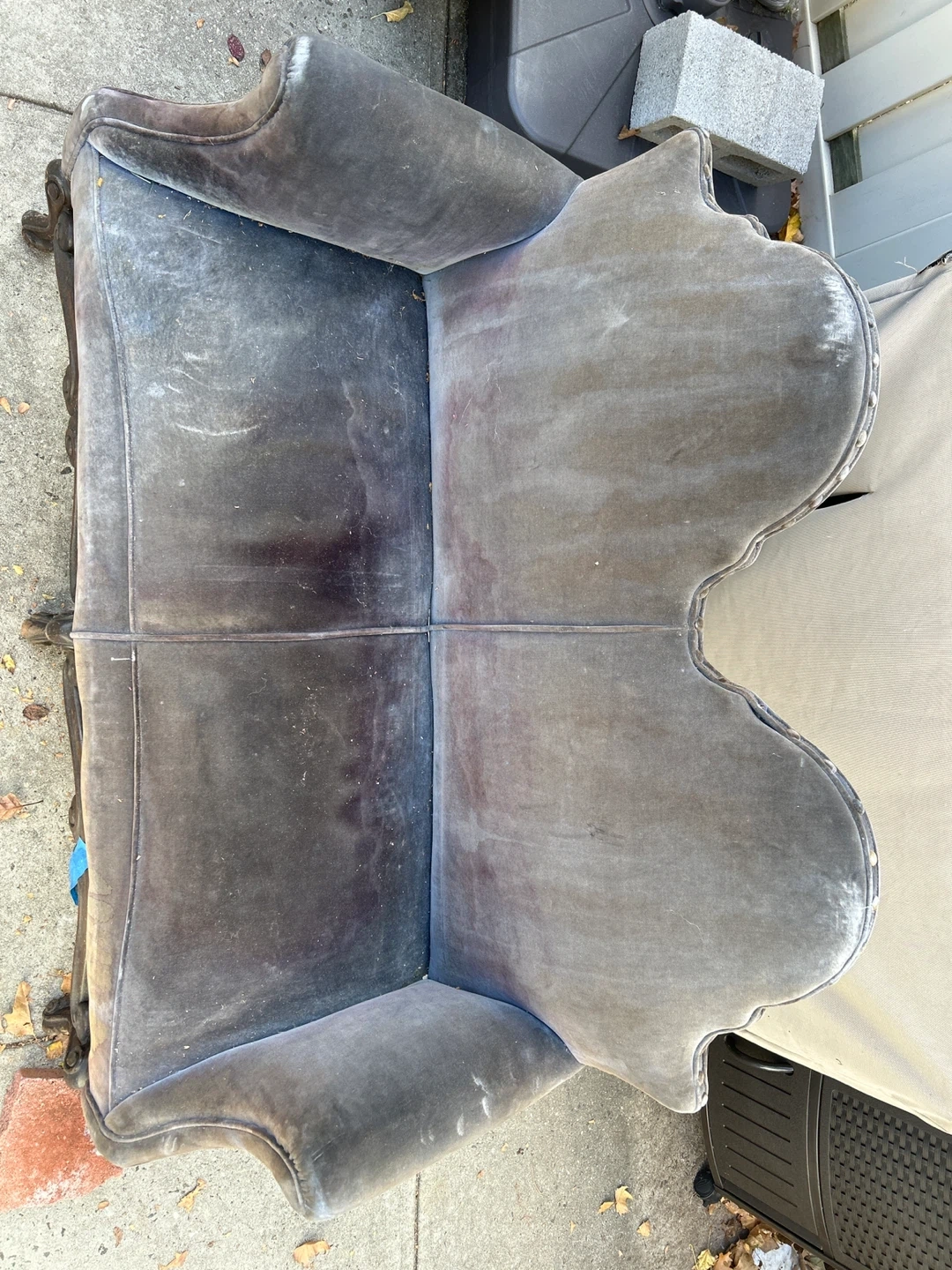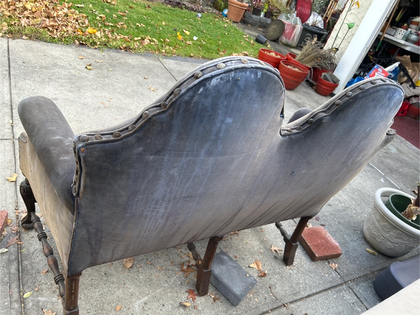 Selling a vintage loveseat settee. It has a unique design with a distinctive curved back and ornate wooden legs. The upholstery appears to be a soft, plush material. It shows signs of wear and use, but still has a lot of charm!