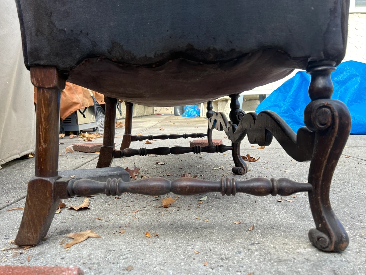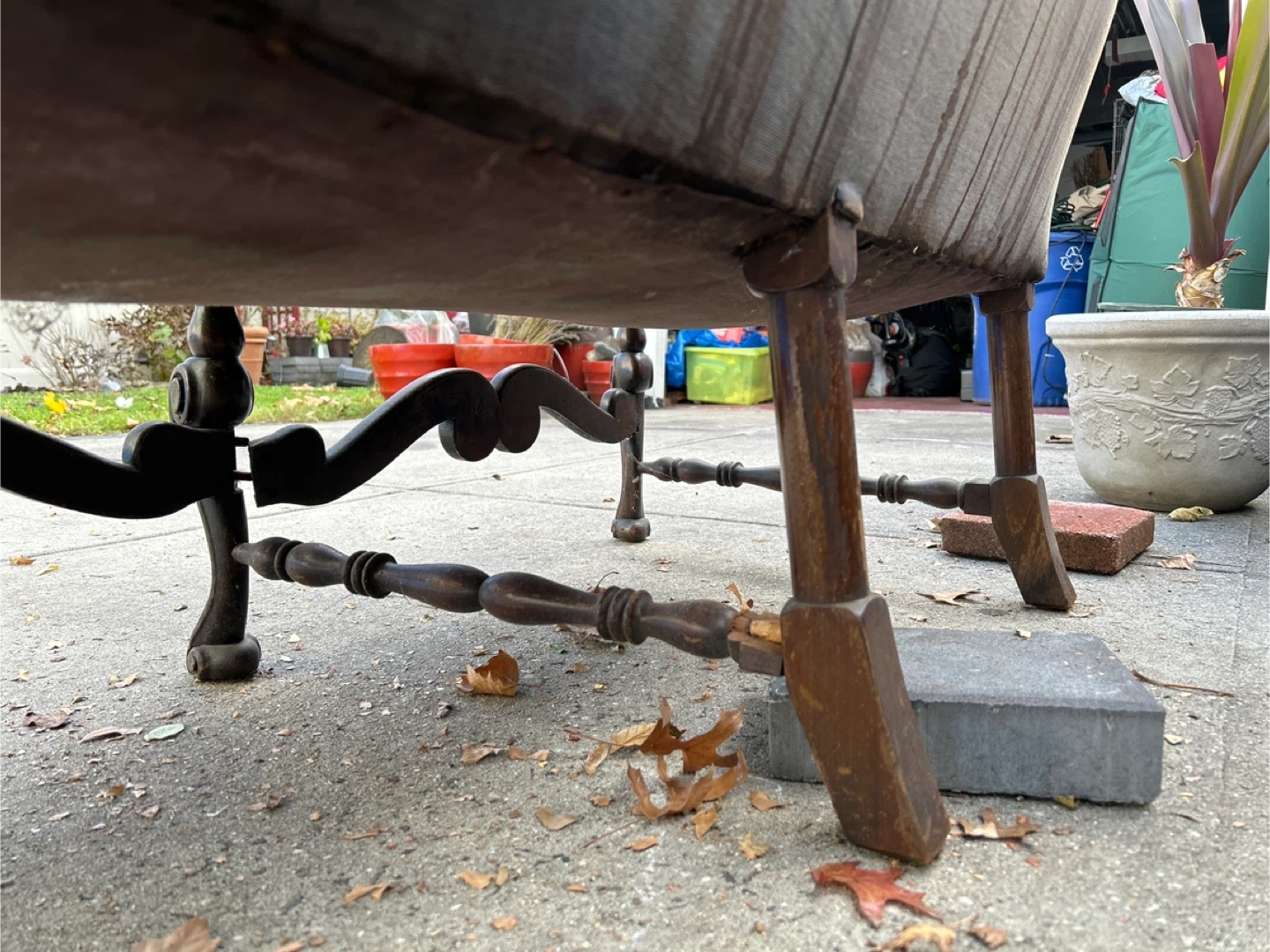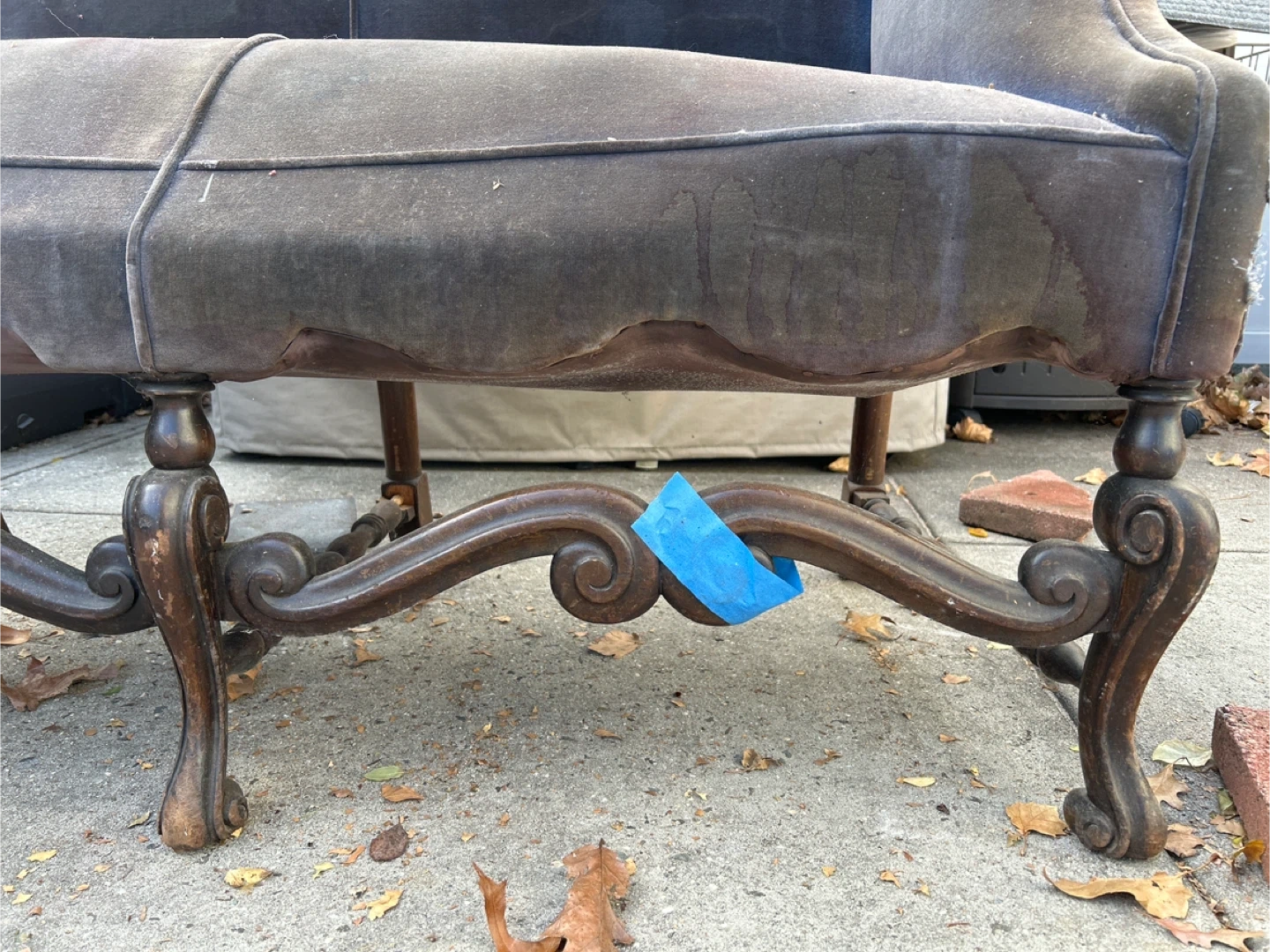 Selling a vintage loveseat settee. It has a unique design with a distinctive curved back and ornate wooden legs. The upholstery appears to be a soft, plush material. It shows signs of wear and use, but still has a lot of charm!