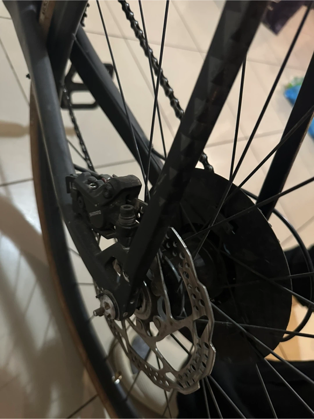 Selling a gravel bike featuring Shimano components. The bike is black and appears to be in good condition. It has disc brakes for reliable stopping power and a comfortable-looking seat. Perfect for hitting the trails or cruising around town!