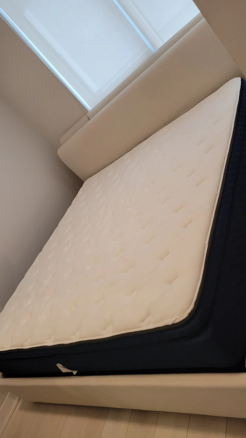 Selling a bed frame in almost condition! It features a simple, upholstered design that would look great in any bedroom. The neutral colour makes it easy to match with your existing decor. Let me know if you're interested!
