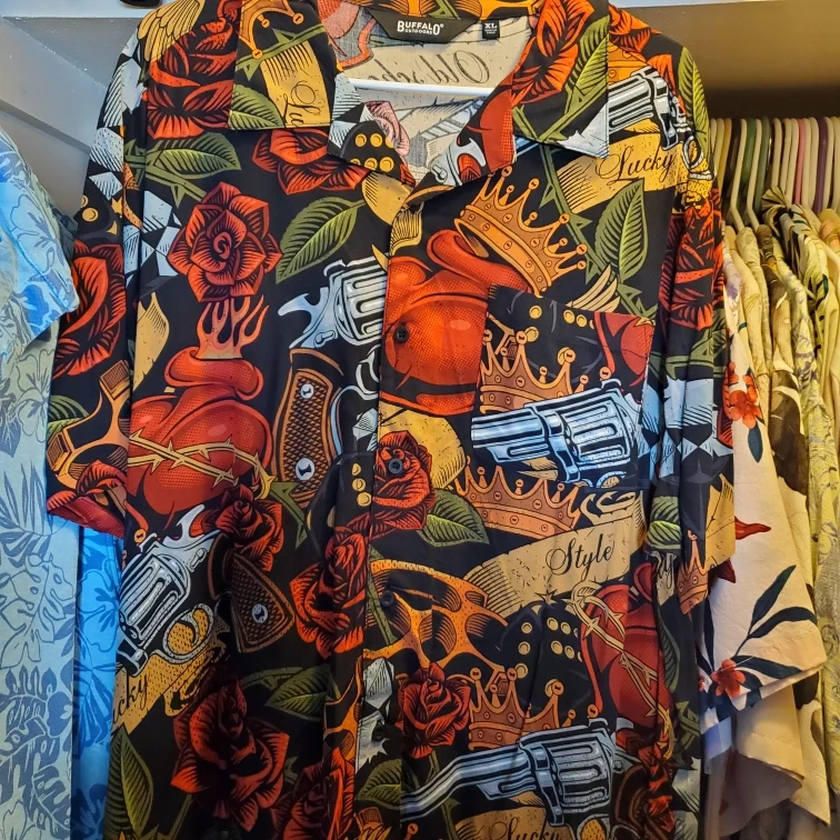 Selling a Buffalo button-down shirt in size XL. It features a unique design with roses, crowns, guns, and hearts. The shirt is in great condition and ready for a new home!