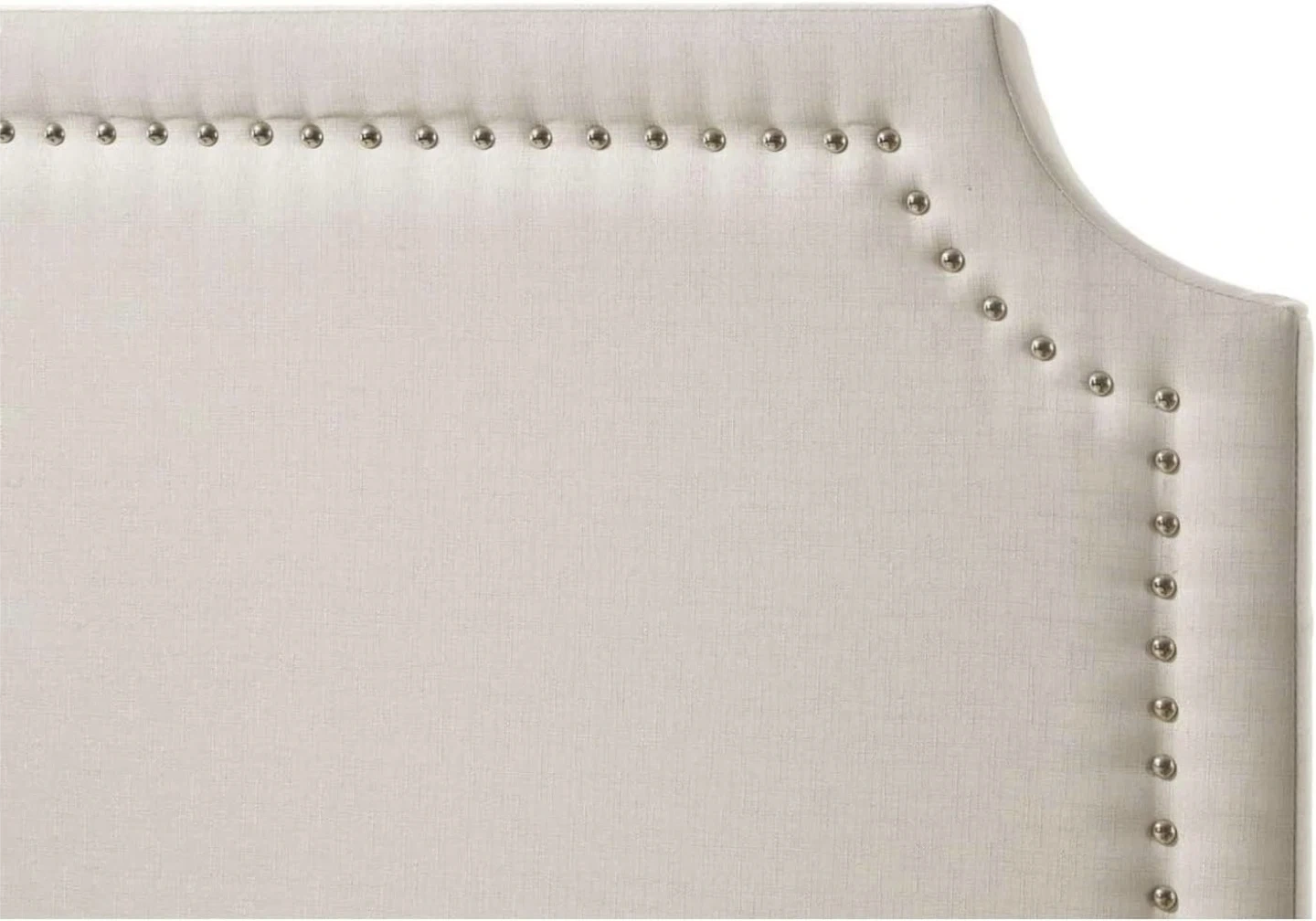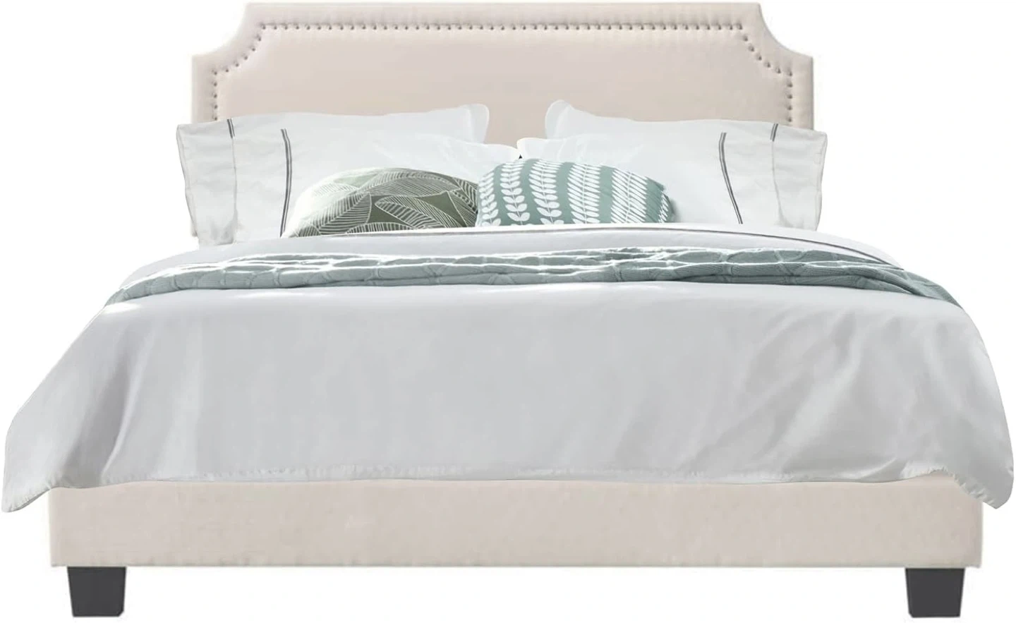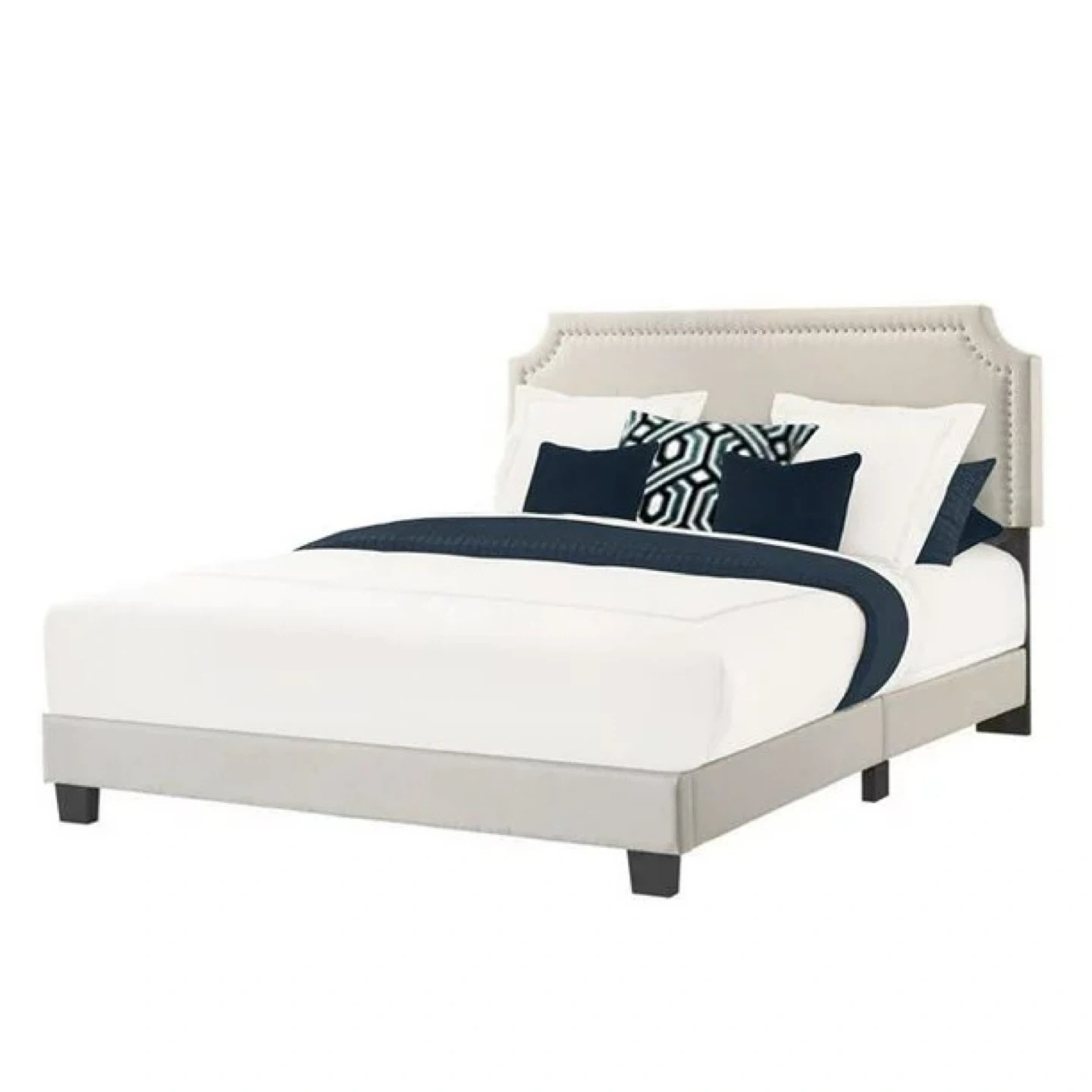 This brand new upholstered platform bed frame features a stylish nailhead trim. It would be a great addition to any bedroom!