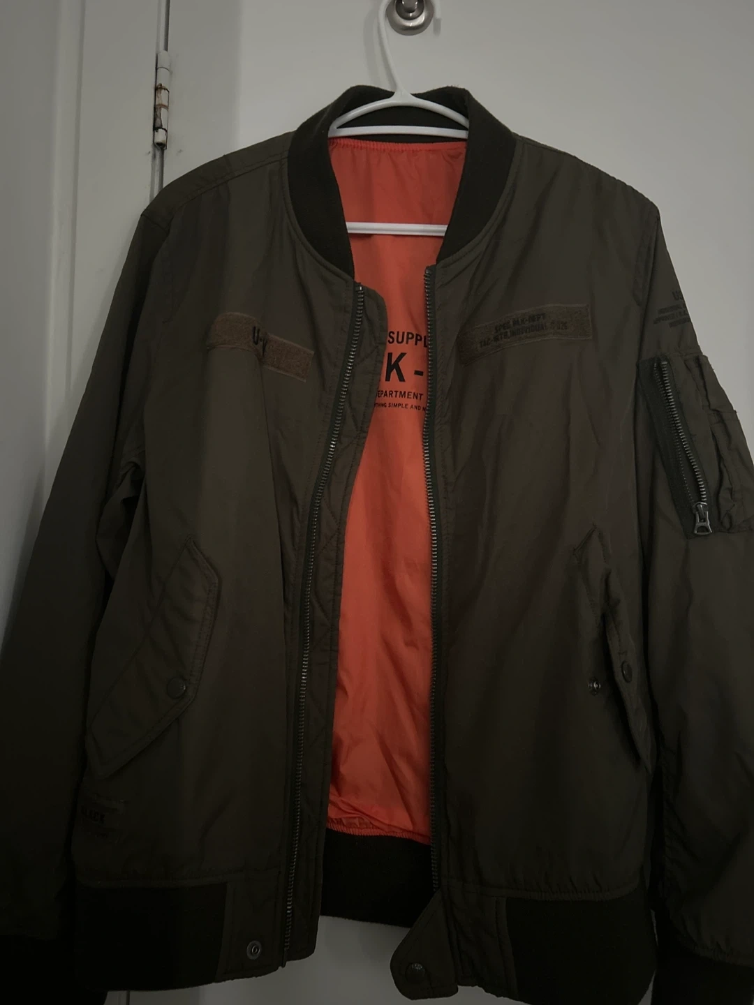 Bomber jacket in olive green. It a cool, classic look. Perfect for adding a bit of style to your wardrobe!