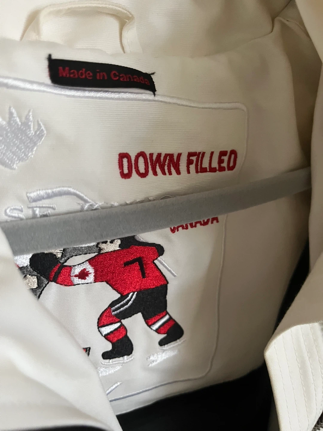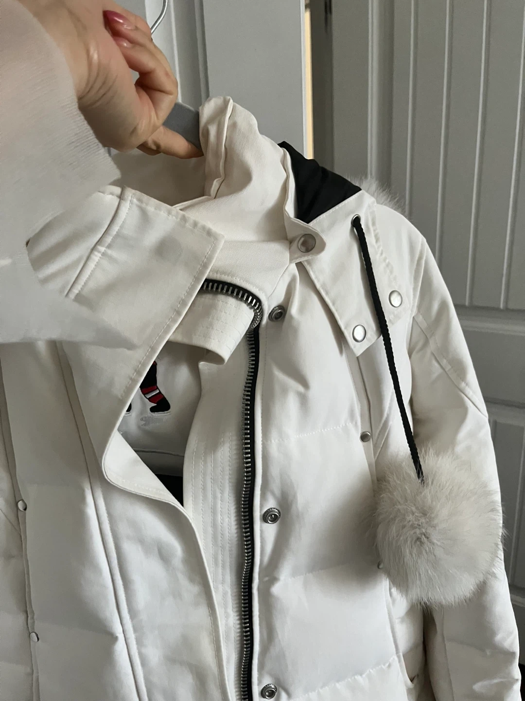 Here's a beautiful white Moose Knuckles parka, perfect for the Canadian winter! It's down-filled and super warm. The size is S/P.