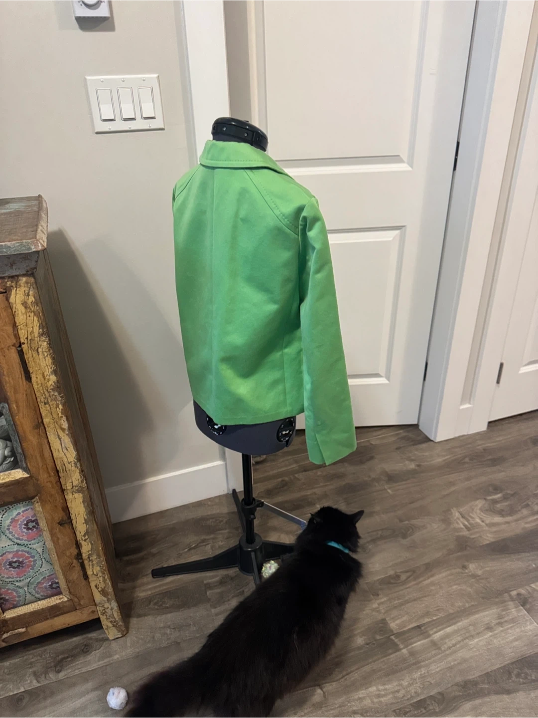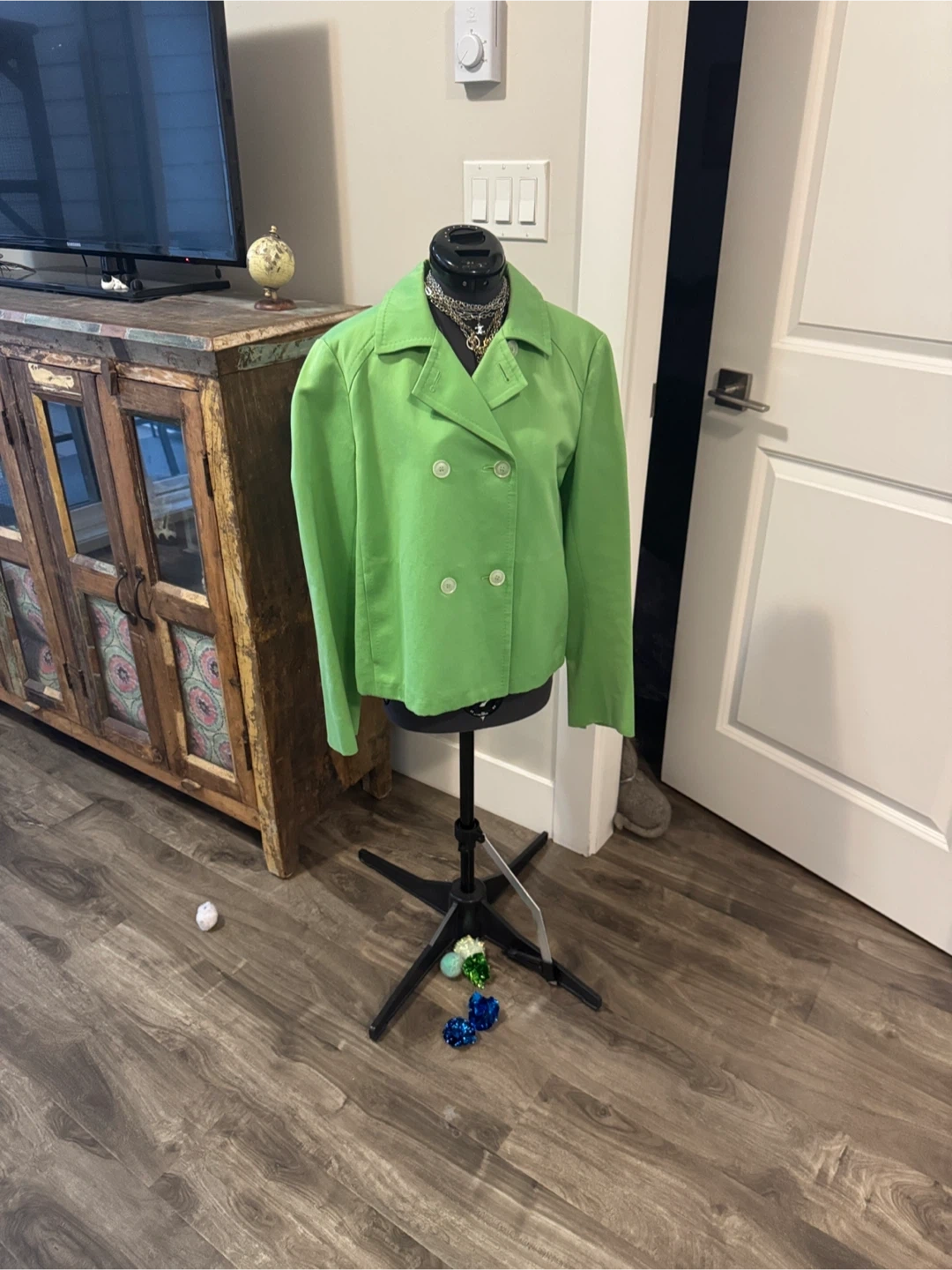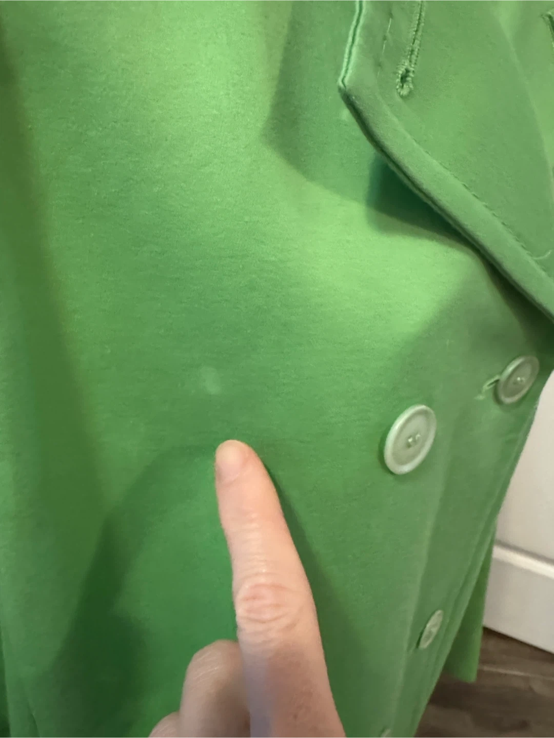 357Stylish lime pea coat with a classic double-breasted design. Perfect for adding a vibrant touch to your outfit. 100% π― cotton. Only lined @ sleeves. Small mark to sleeve & front right chest. Thread bare at lapel. Price reflects condition. 2 front pockets Length 22.5β Pit to pit 19β Sleeves 24β