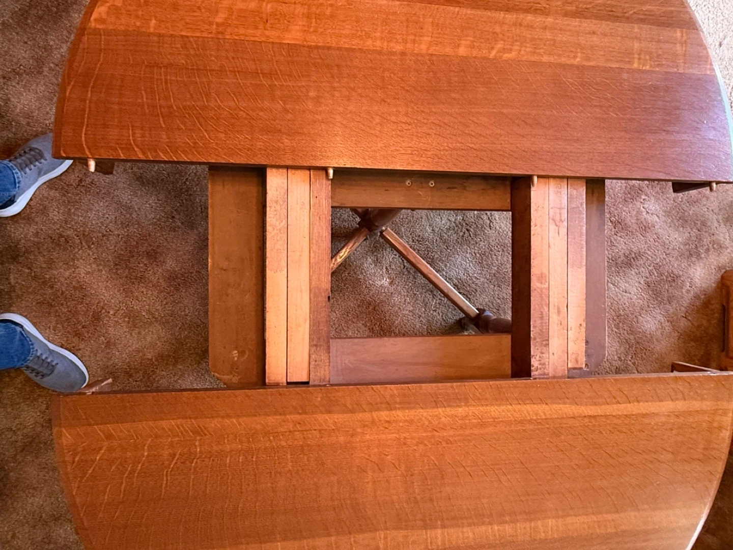 Late 1930s / early 1940s three-leaf (drop in) dining table. Solid oak construction, in exceptional condition. 1m round when closed, stretches to 1m x 1.8m when fully extended, and can seat 8 to 10 people. Casters roll cleanly, top detaches for easy transport.