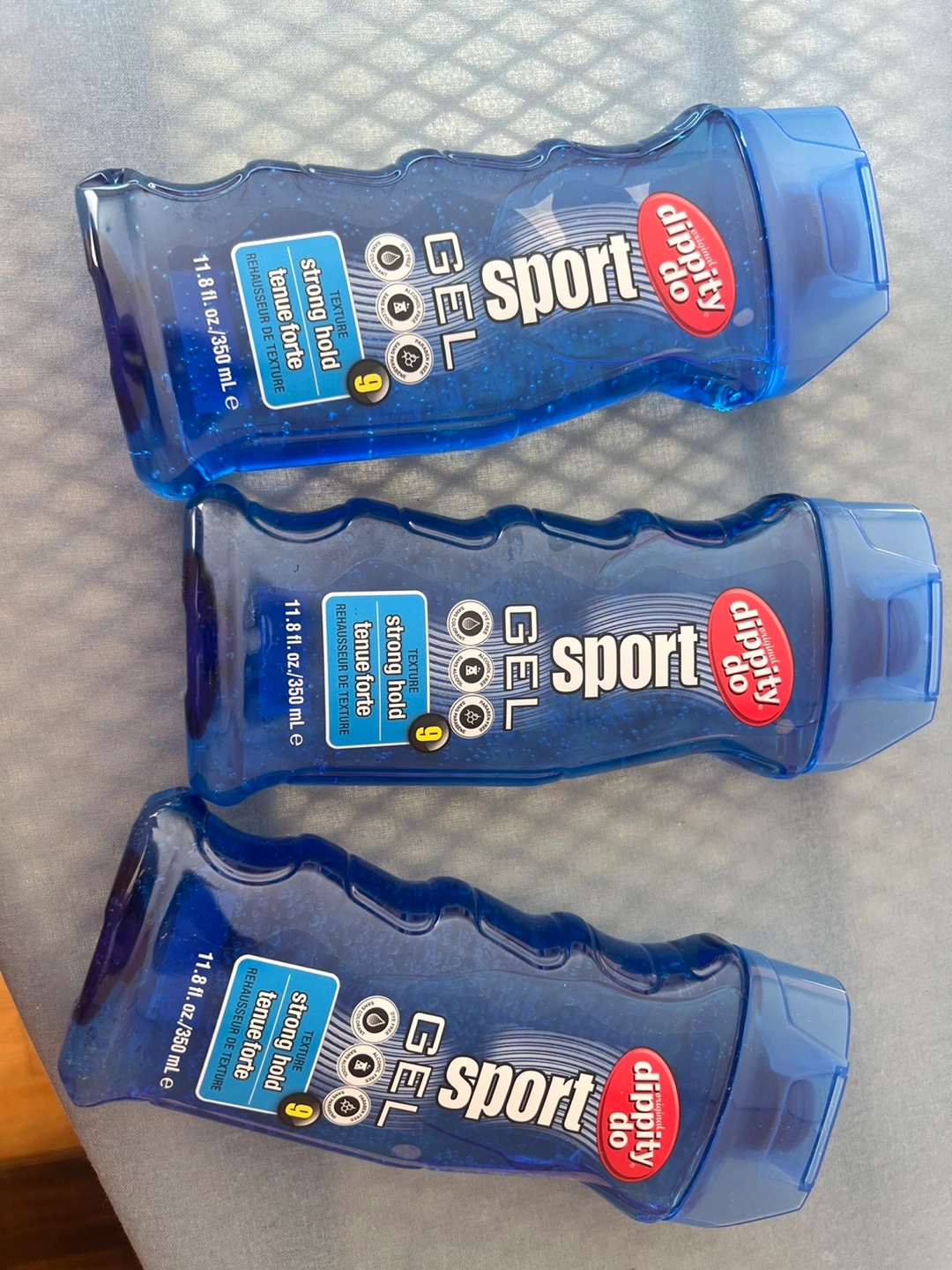 Selling three bottles of Dippity Do Sport Gel for a strong hold. Each bottle contains 350ml (11.8 fl oz). Perfect for keeping your hair in place during any activity!