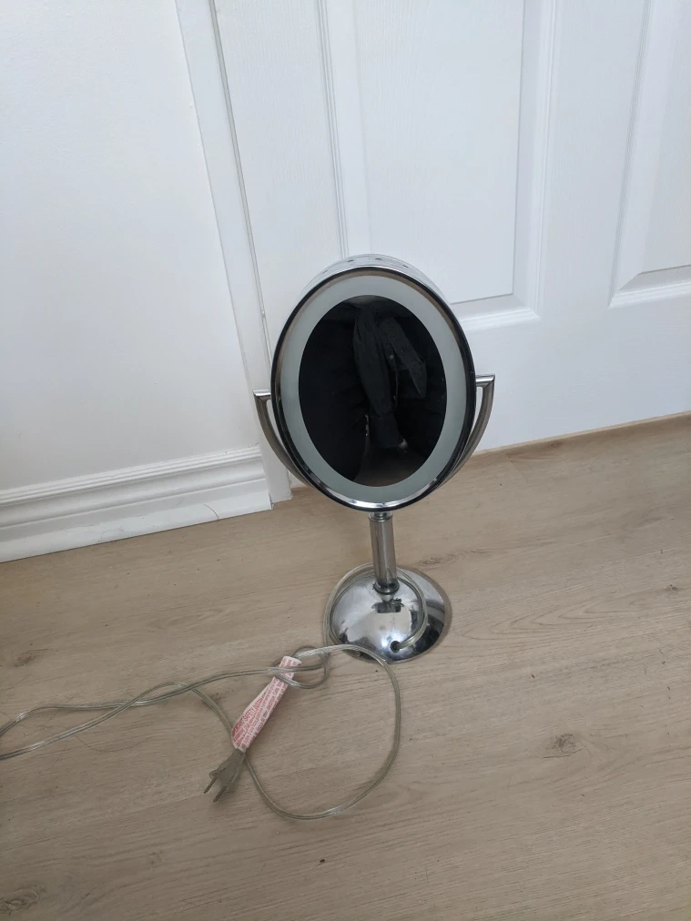 Selling a chrome vanity makeup mirror! It's in great condition and would be perfect for your bathroom or vanity table. It has a sleek, modern design and provides excellent lighting for makeup application or grooming. One side is popular mirror, one side is makeup mirror. Good condition. Pick up at 195 Merton Street Toronto or pick up at subway station Davisvill. And I can deliver it to your house but you need to pay me another $3. Thanks.