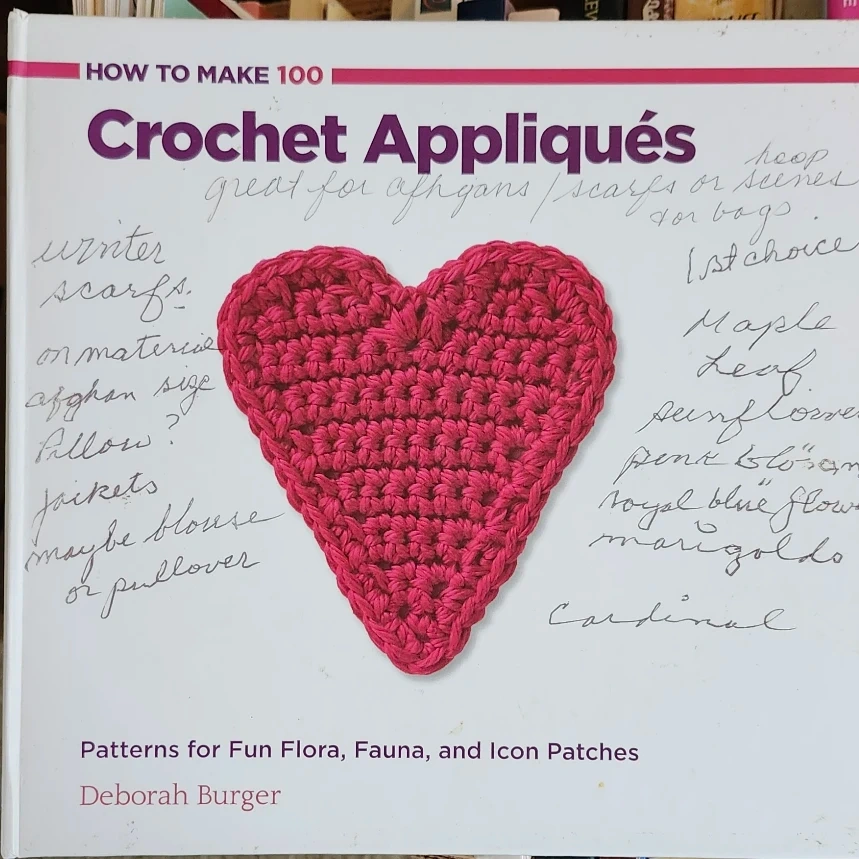 Selling a book called 'How to Make 100 Crochet Appliqués' by Deborah Burger. It has patterns for fun flora, fauna, and icon patches. Great for afghans, scarves or scenes for bags!
