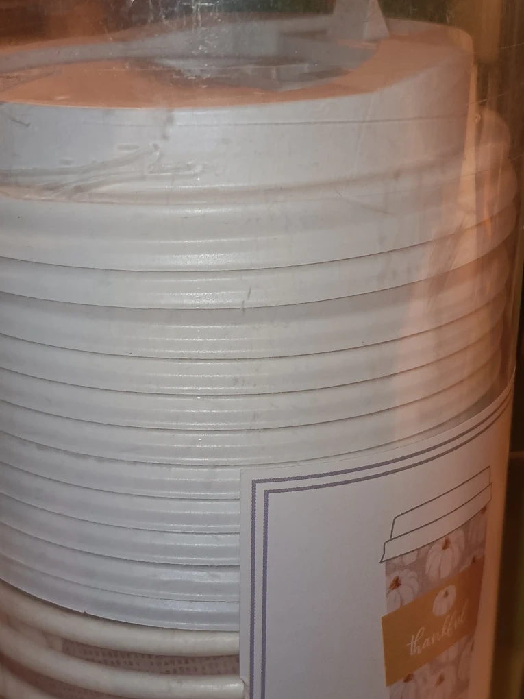 I'm selling a set of disposable cups, perfect for the fall season! The design features white pumpkins and a 'thankful' message. You'll get 12 cups, 12 lids, and 12 sleeves, all in the original packaging