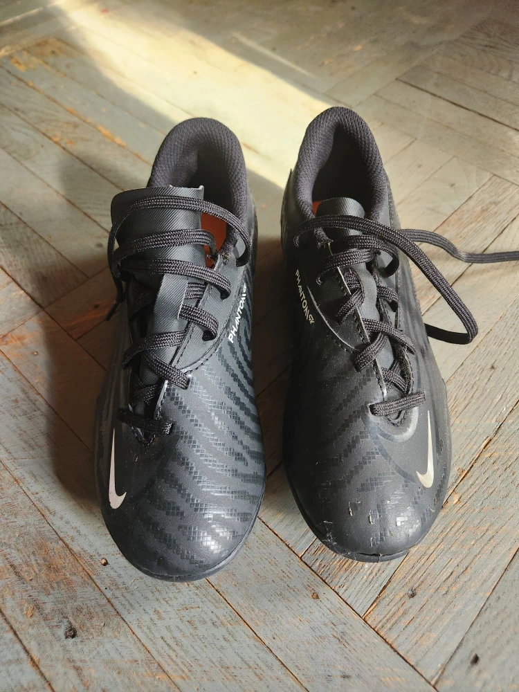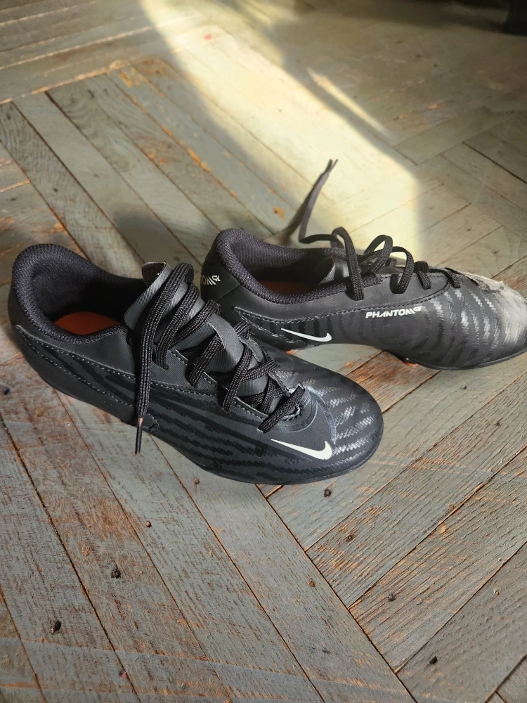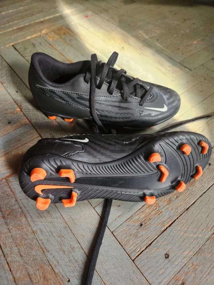Selling a pair of Nike Phantom soccer cleats! They are black with a unique pattern and the Nike swoosh on the side. The cleats are orange. Size 1.5 youth. Great training cleats for your young athlete.