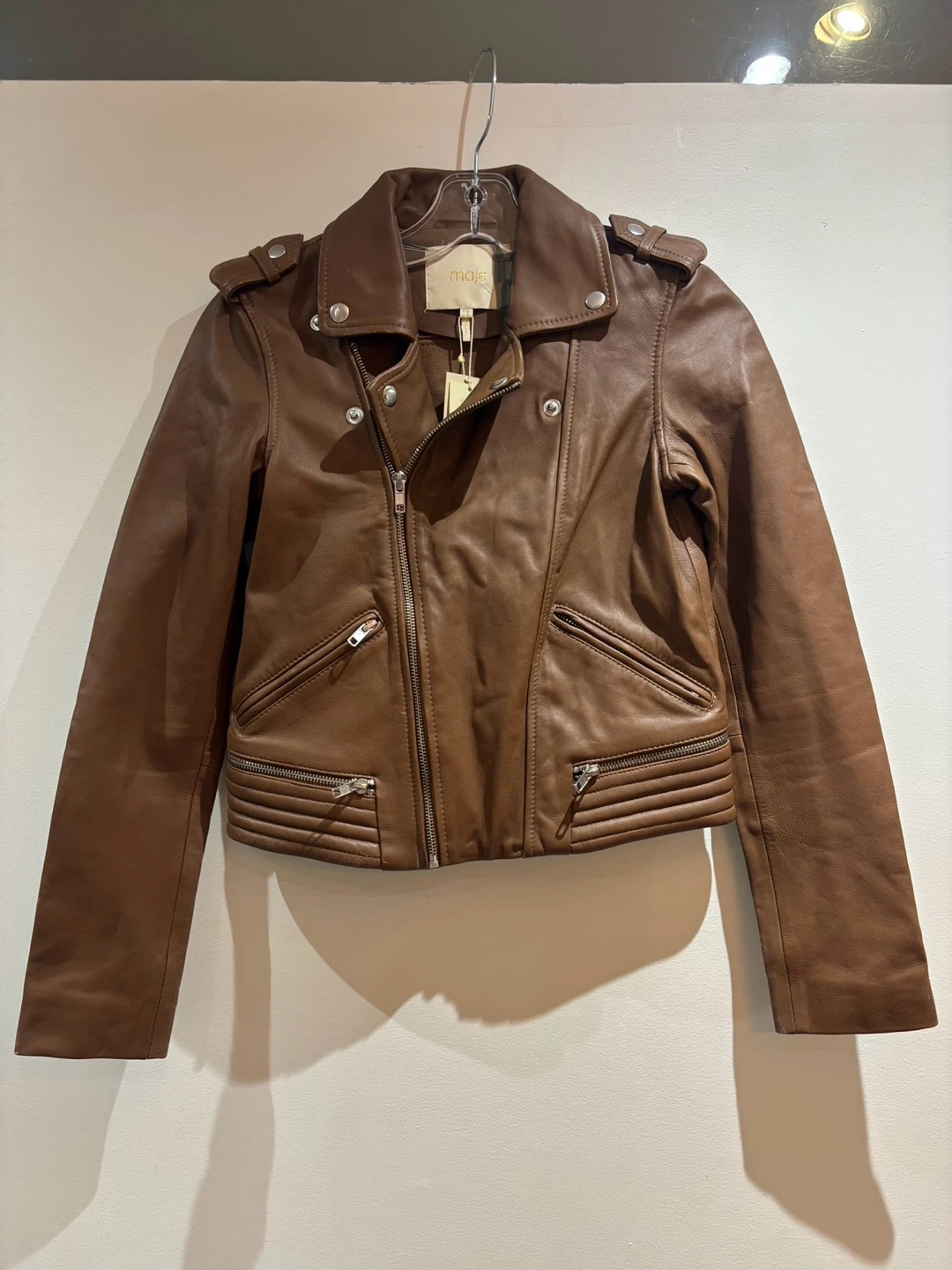 Stylish tan leather jacket with zipper details. Perfect for a bold look.