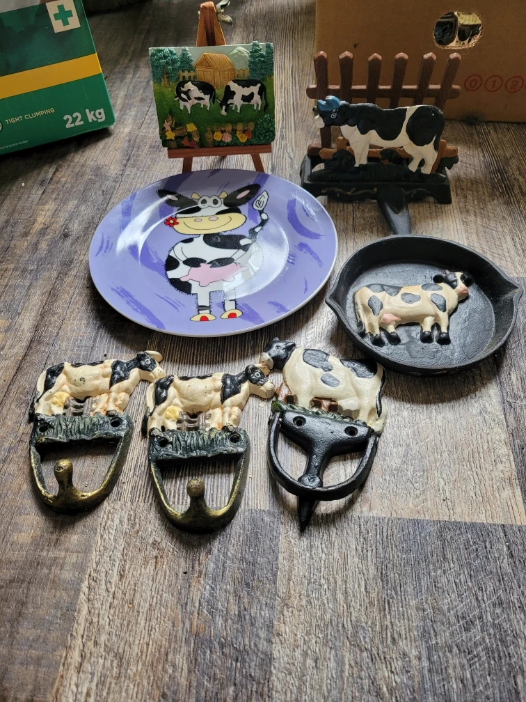 Selling a collection of cow-themed decor items! There are various pieces, including a small wooden box, wall hangings, figurines, and framed pictures. They'd be perfect for adding a touch of country charm to your home