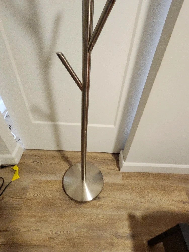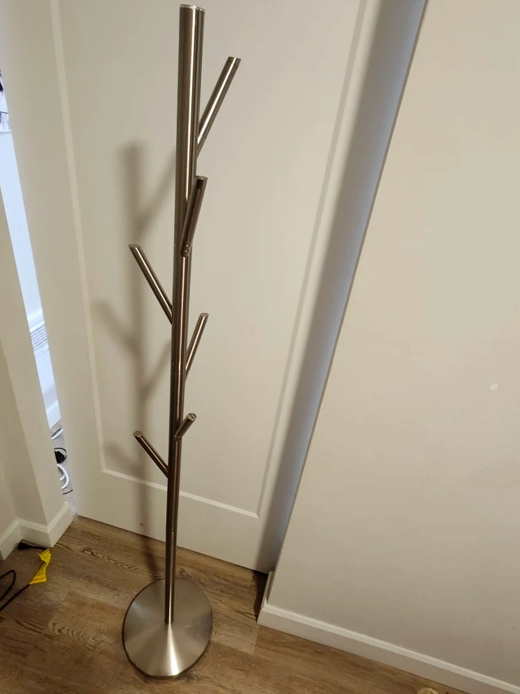 This standing coat rack is perfect for keeping your entryway tidy! It has a sleek silver finish and a sturdy base. Great for hanging coats, hats, and scarves.
