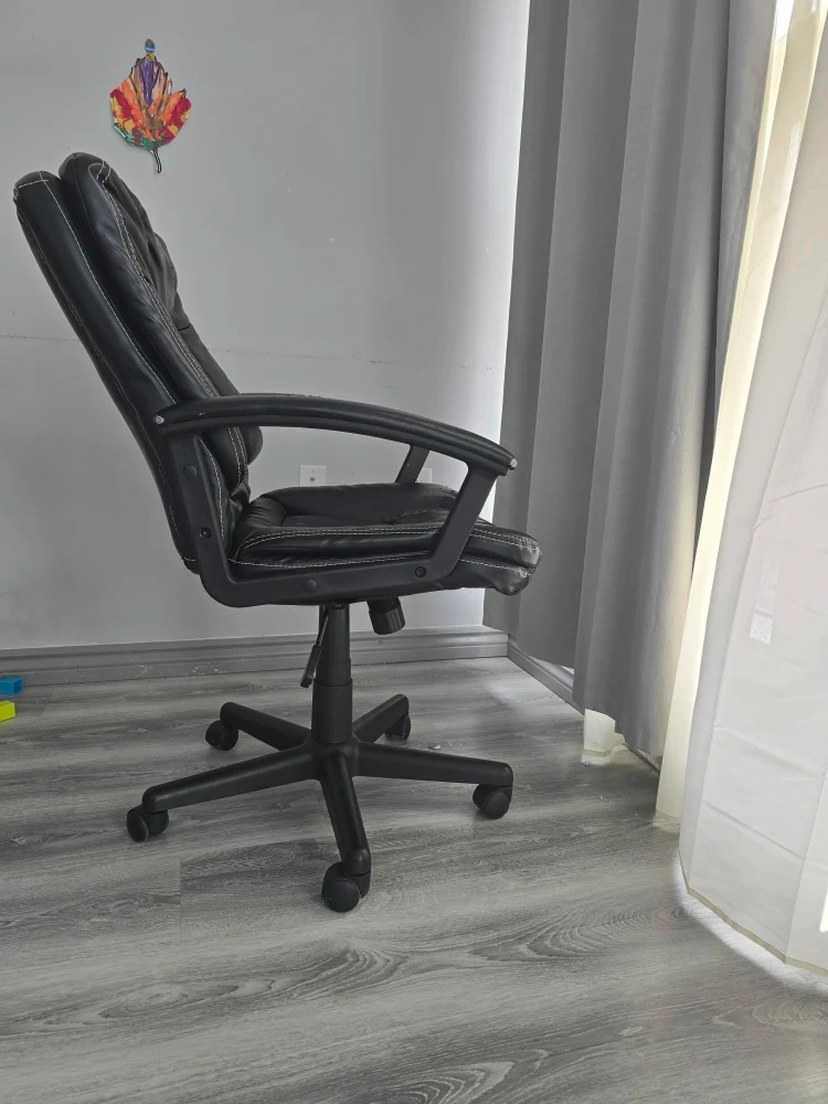 Selling a black leather office chair. It's still in good condition and very comfortable for working from home or gaming. There are some signs of wear on the armrests and seat, but it doesn't affect the functionality of the chair. Perfect for your home office setup!
