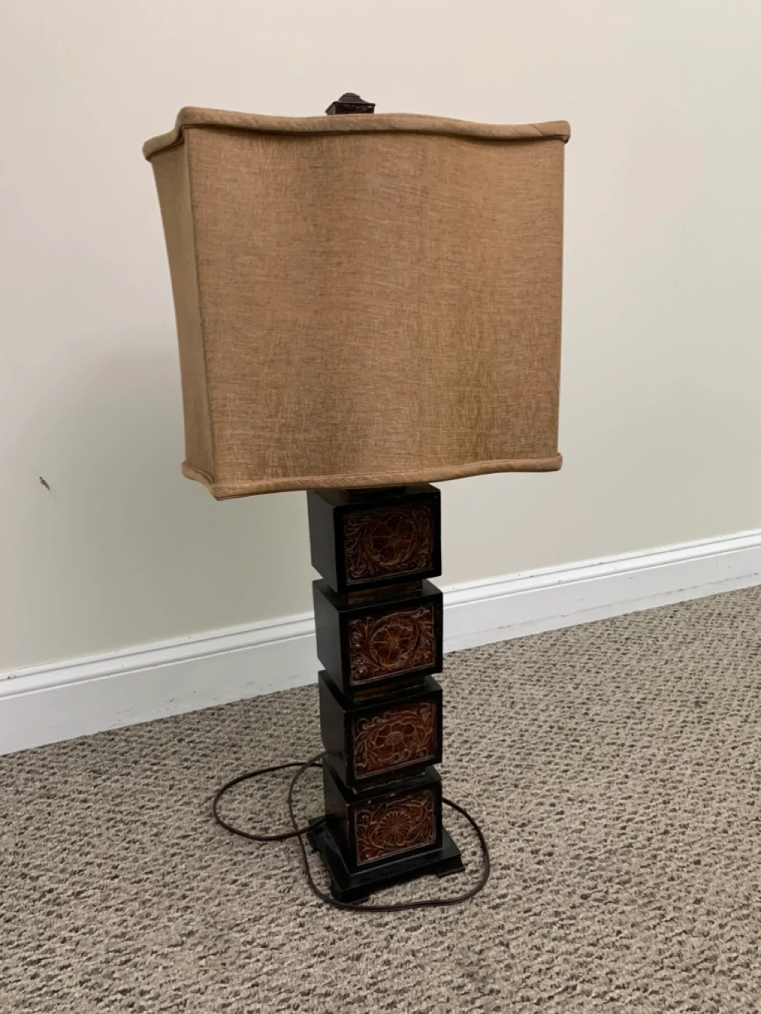 Selling a unique accent lamp! It features a brown shade and a black base with decorative carvings. It would be a great addition to any room!