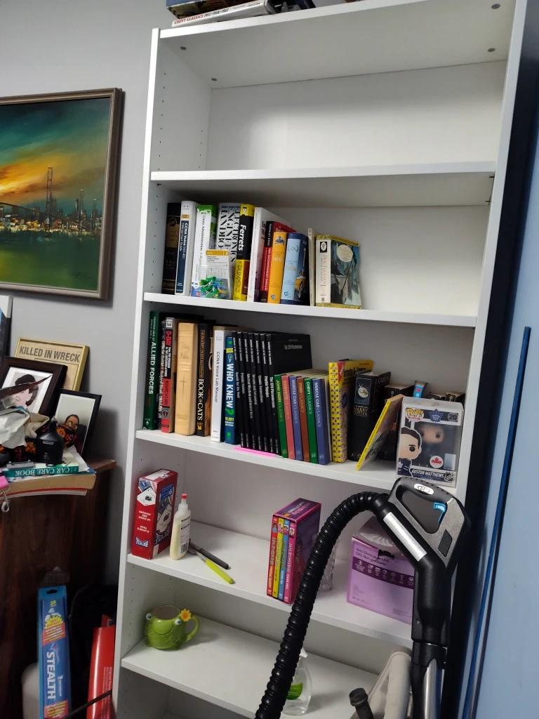 Selling a white bookcase, perfect for organizing your books and other items. It has multiple shelves to maximize storage space. It's in good condition and ready for a new home!