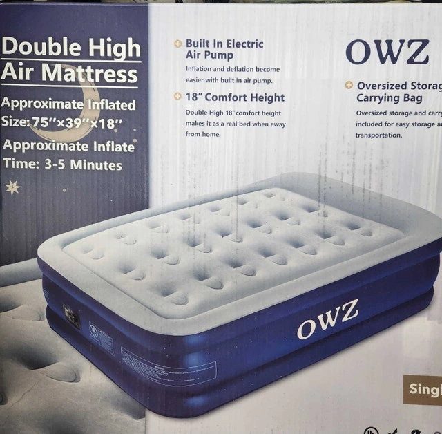 OWZ Double High Air Mattress Approximate Inflated size: 75"×39"×18" Inflated time: 3-5 minutes Condition: like new, barely used, still in box. Bought on Amazon for $150 Selling for $100 or best offer If interested please call or text 613-583-7172